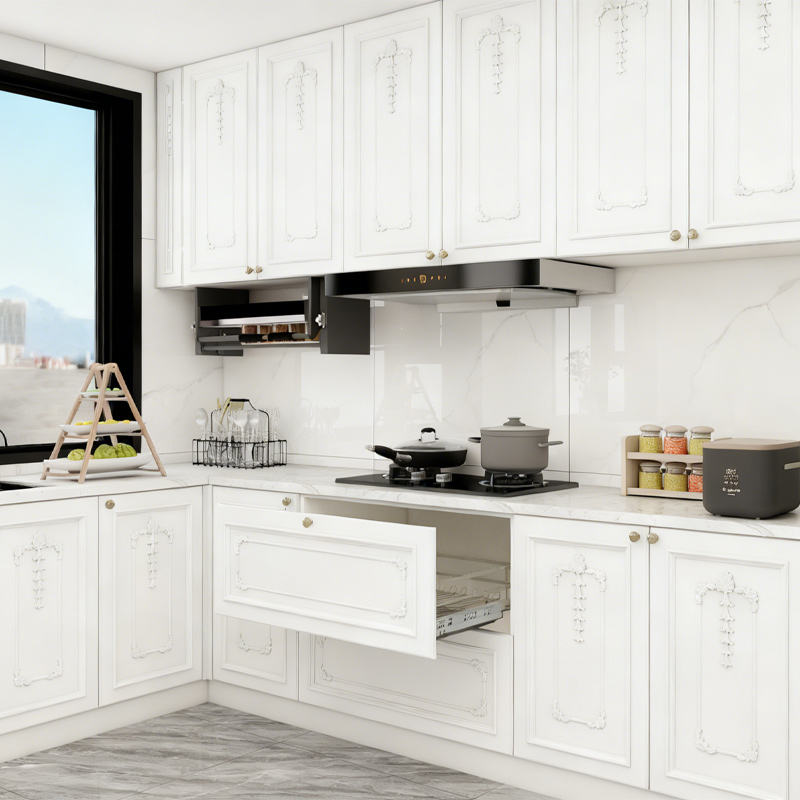 Louvre White Finish Carved Wood Kitchen Cabinet Body Plywood Cabinet Door Solid Wood Red Oak Painted High-end Configuration