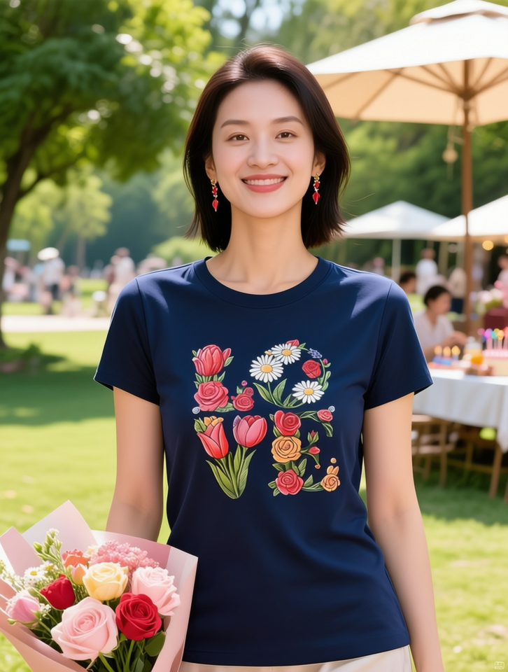 Love Flower Design Women's Short Sleeve Round Neck T-Shirt Lightweight Cotton Casual Summer Floral Print Gift Fashionable