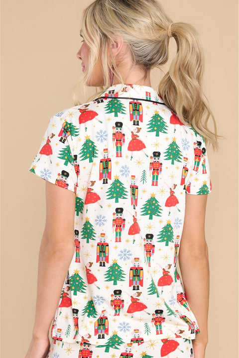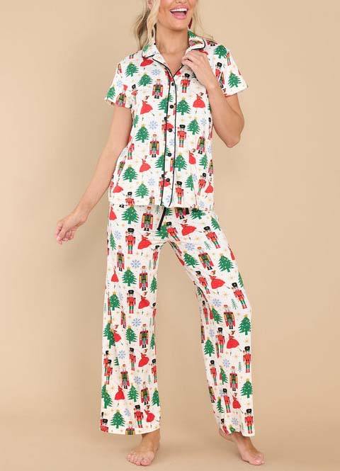 Loveda New Women's Clothing Sleepwear White Printed Christmas Pattern Buttoned 2 Piece Satin Pajamas for Women Set