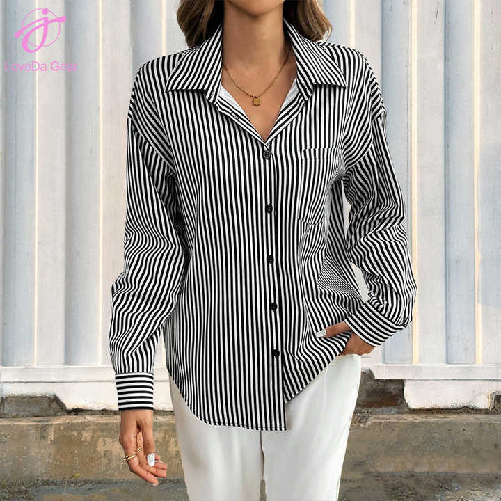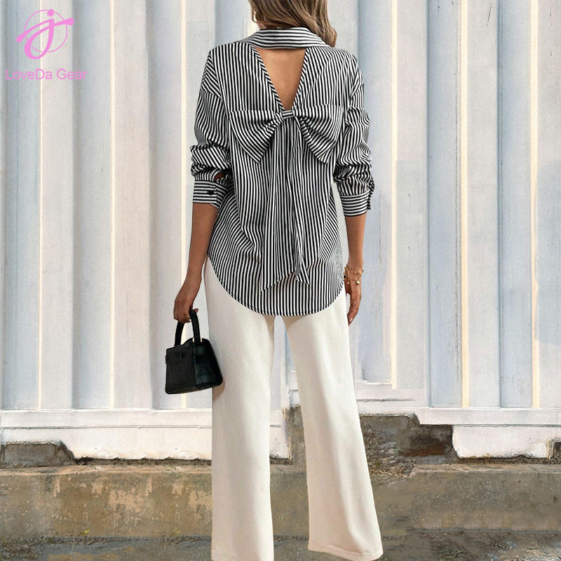 Loveda Summer Hot Selling Women Casual Black White Stripe Printed Bow Back Button Front Long Sleeve Shirt