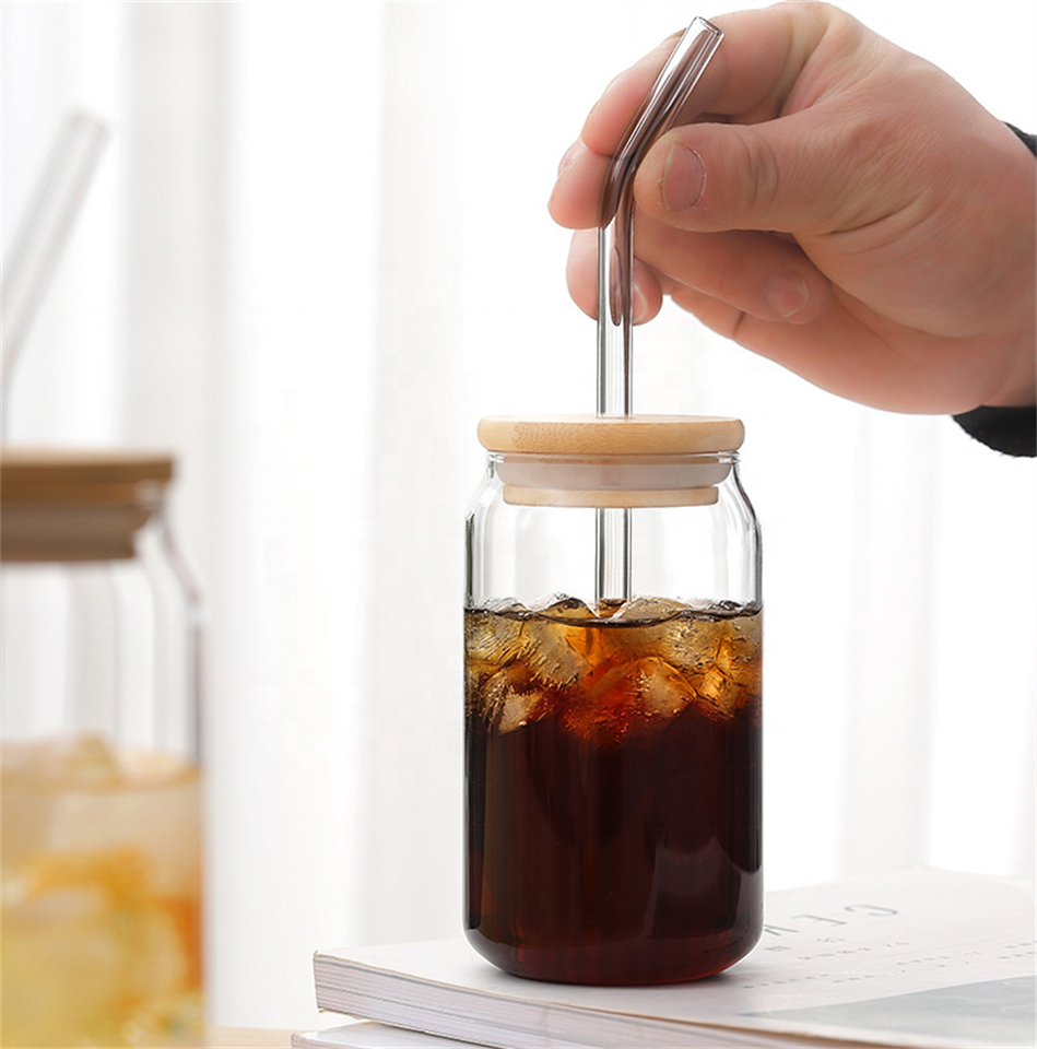 Bicchiere in vetro Mason Jar 12/16oz trasparente con coperchio in bambù e cannuccia, logo personalizzato MOQ basso per regali B2B