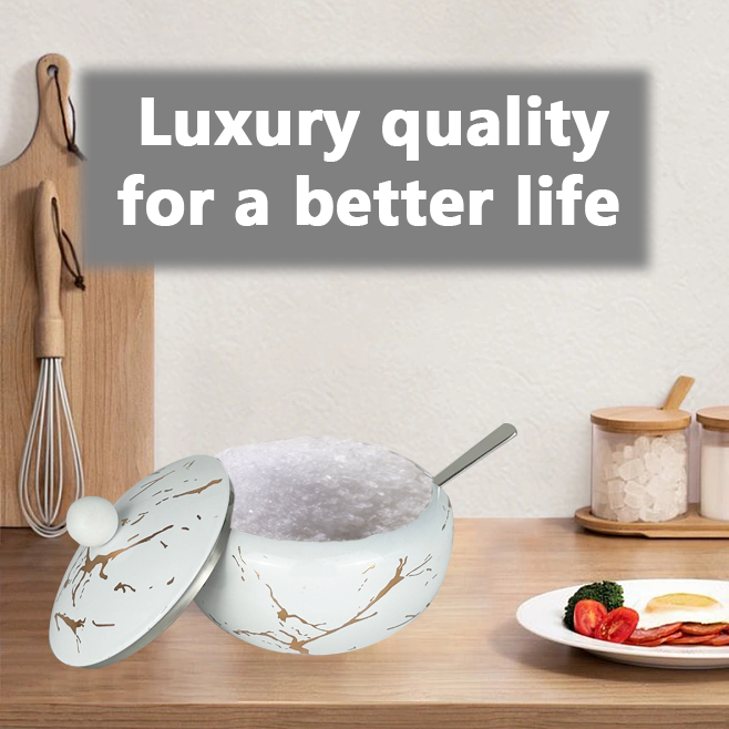 Basso MOQ fabbrica di alta qualità rivestimento bianco adesivo in argento 304 in acciaio inox ciotola di zucchero con coperchio e cucchiaio in acciaio inox