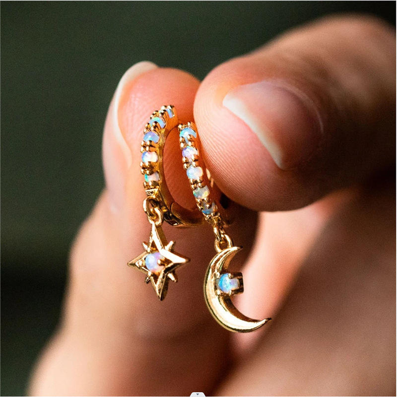 Orecchini a Cerchio Placcati Oro con Ciondolo Luna in Opale, Portafortuna per Donna, Stile Carino per Uso Quotidiano
