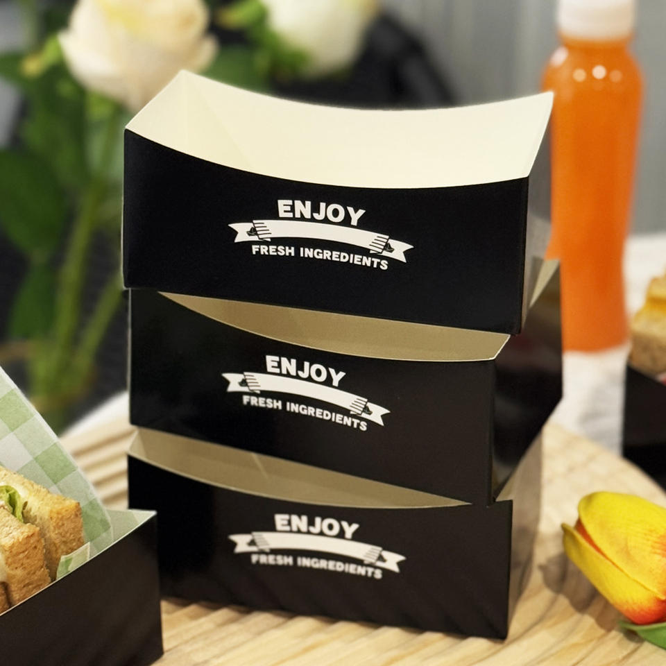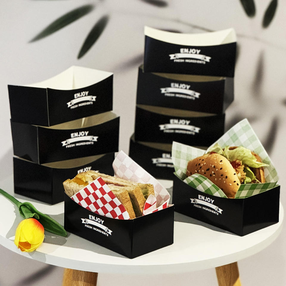 Porta pranzo Hamburger Sandwich Stick di patate dolci in ristorante bar nero vassoio di carta aperta