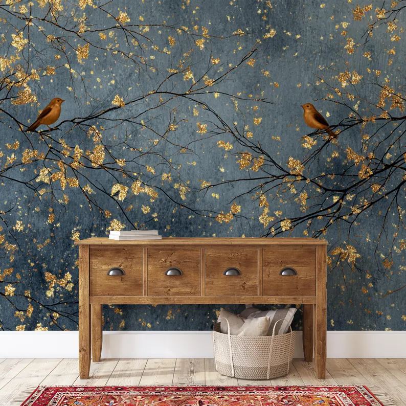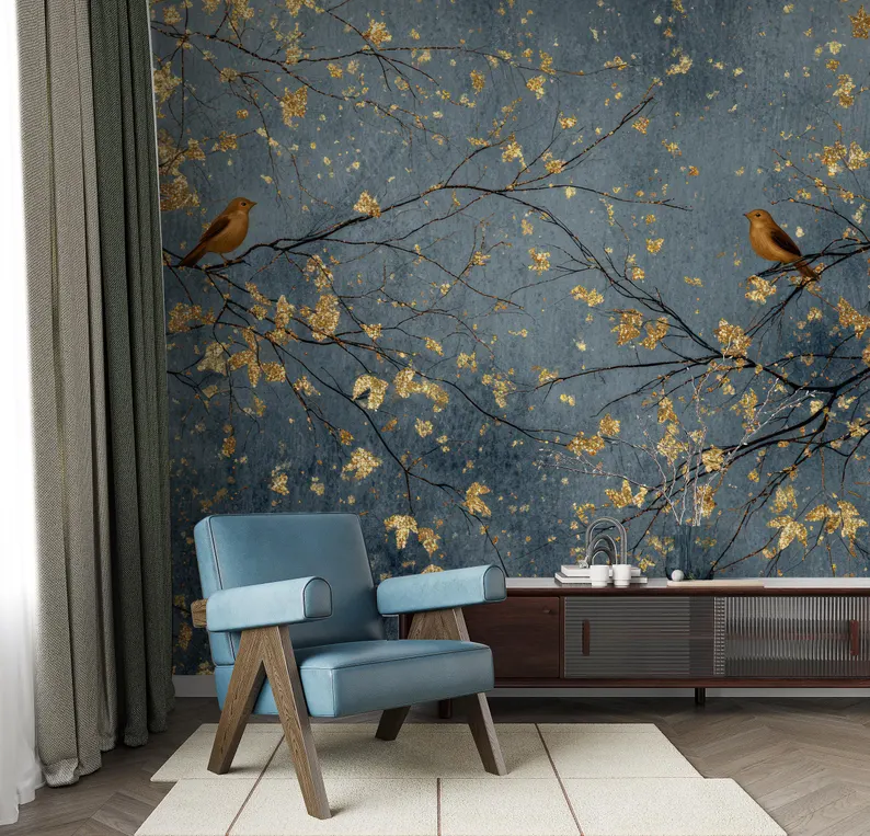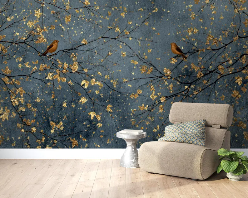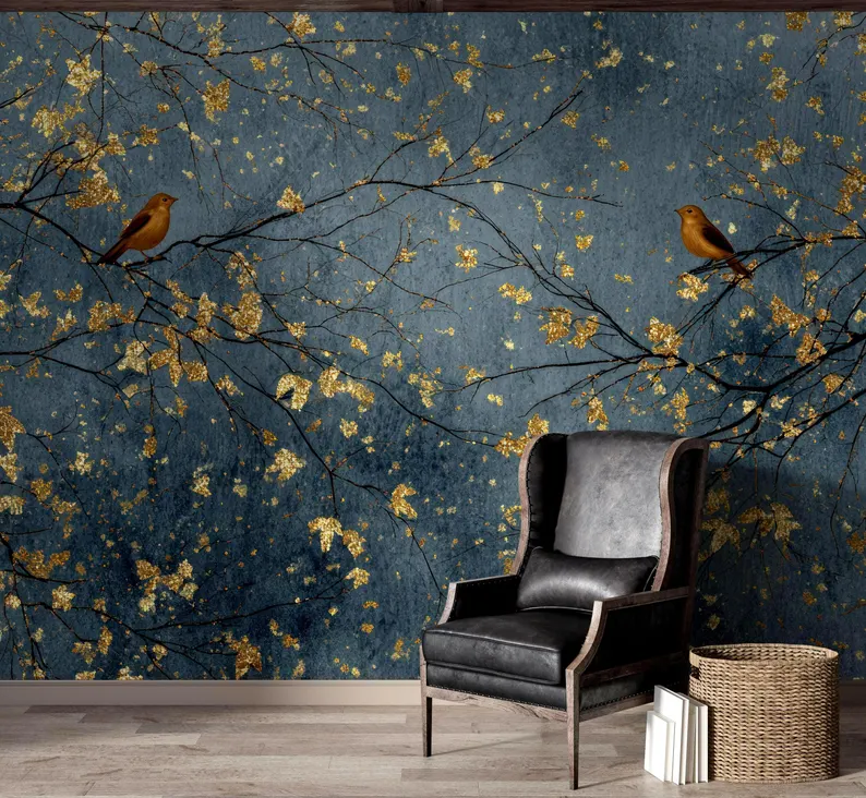 Nome del prodotto:Carta da parati di lusso con alberi e uccelli in blu scuro e oro.