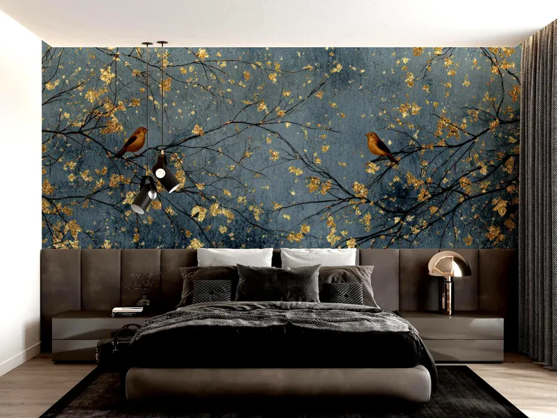 Numero del Modello:Luxurious Dark Blue and Gold Bird Tree Wallpaper