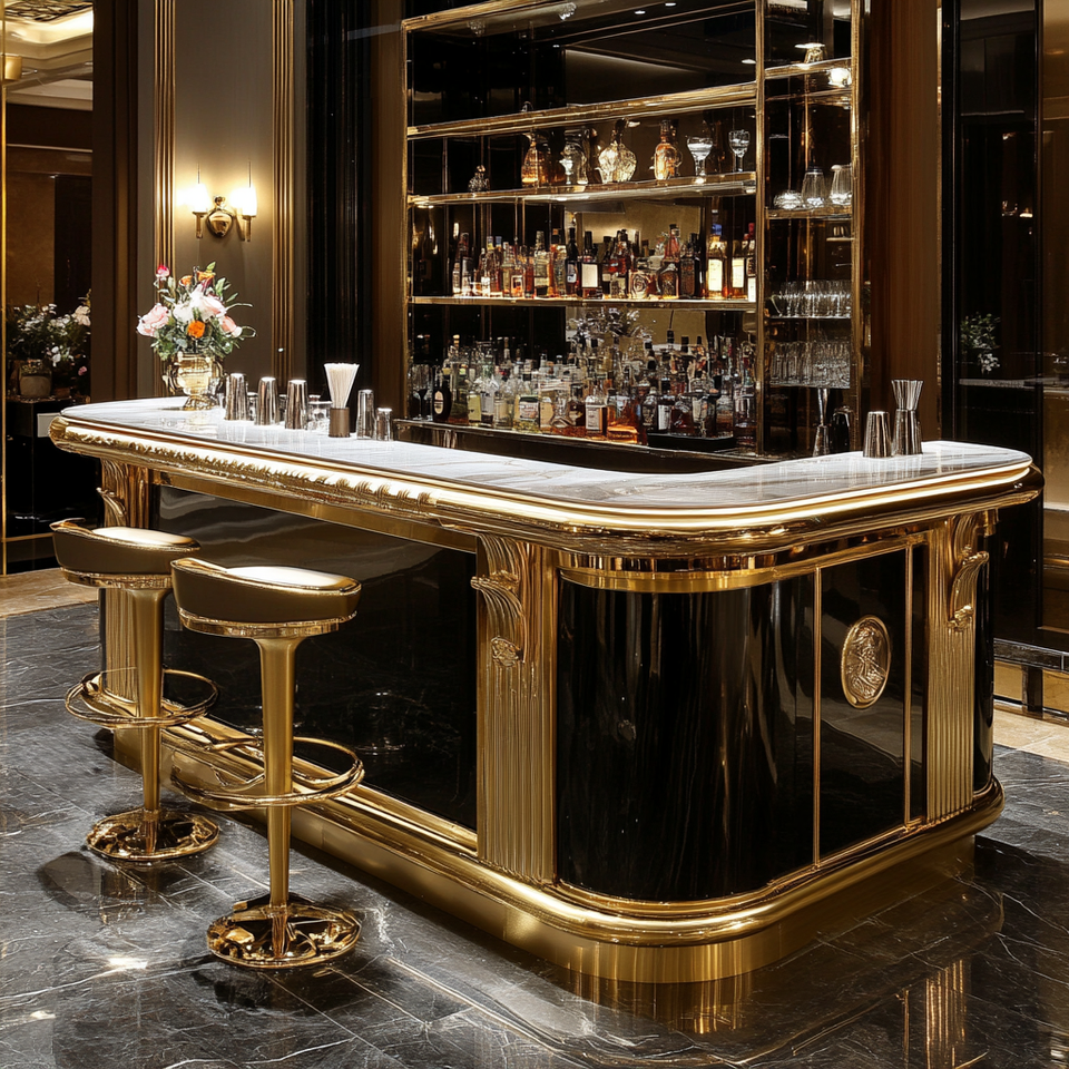 Bancone Bar Moderno di Lusso in Acciaio Inossidabile con Piano in Marmo, Design Autoportante per Bar Domestici e Hotel, Illuminazione a LED