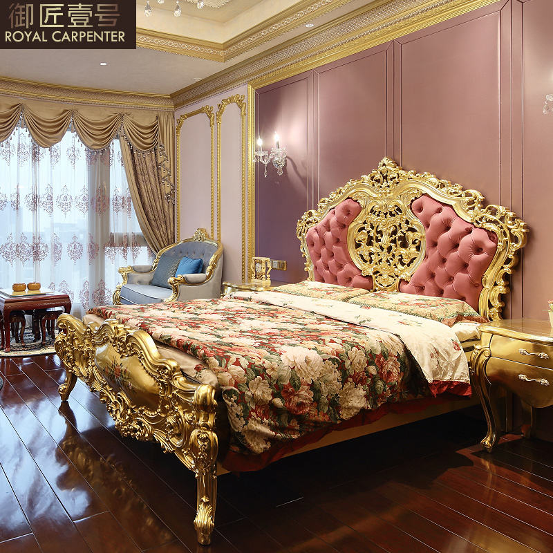 Luxury 1.8m Gold Foil Double Bed European French Italian Style Solid Wood Carved Classics Furniture Bedroom Set
