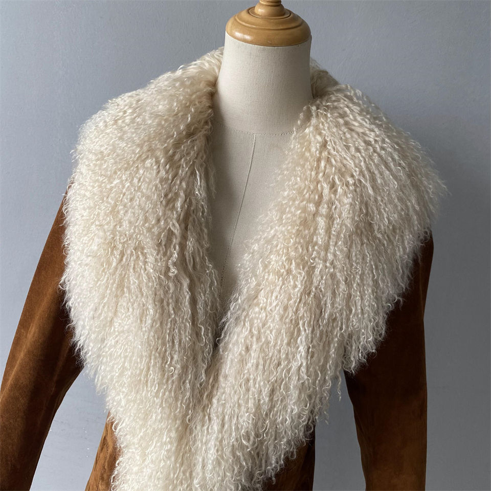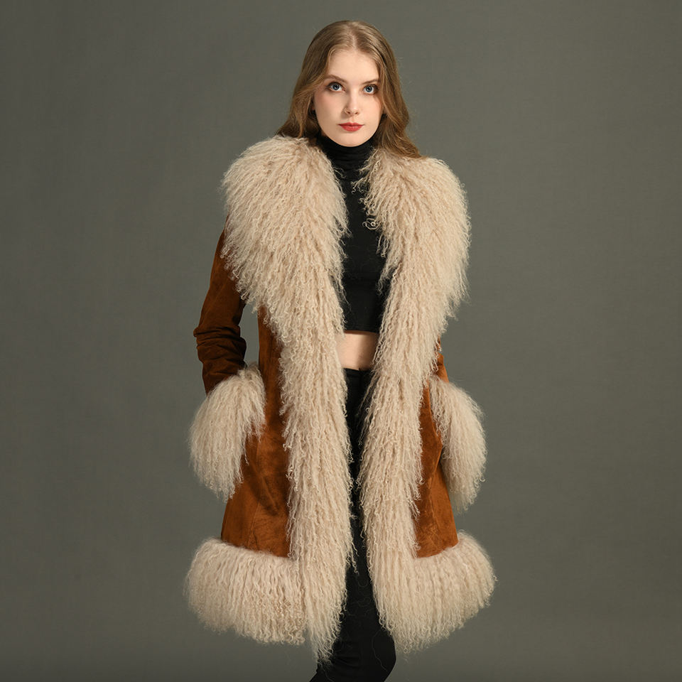 Luxury 100% Natural Wholesale Leather Jackets and Coats With Mongolian Fur Trim Brown Genuine Suede Leather Trench Coat