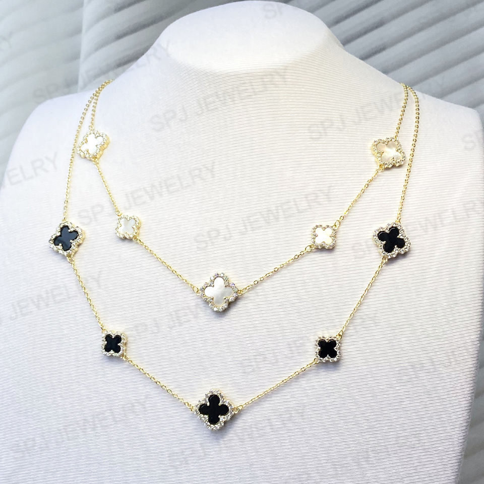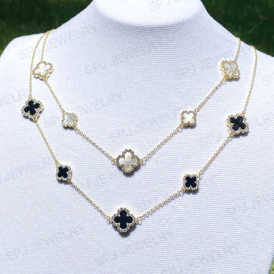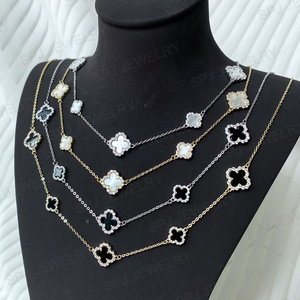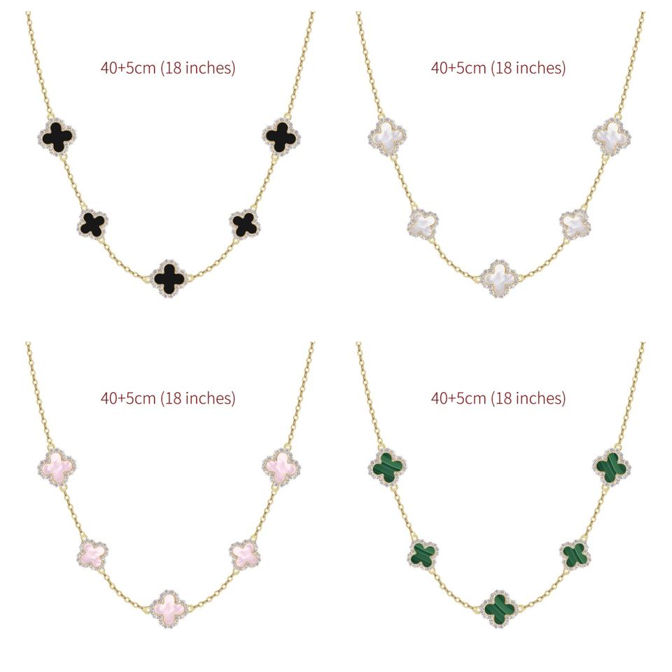 Collana di Lusso in Argento 925 con Quadrifoglio, 7 Fiori in Madreperla e Zirconi 5A, Elegante Gioiello a Doppio Quadrifoglio per Donna