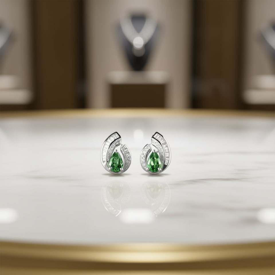 Orecchini a lobo di lusso in argento 925 con smeraldo a goccia e diamanti taglio baguette per donna, da indossare tutti i giorni