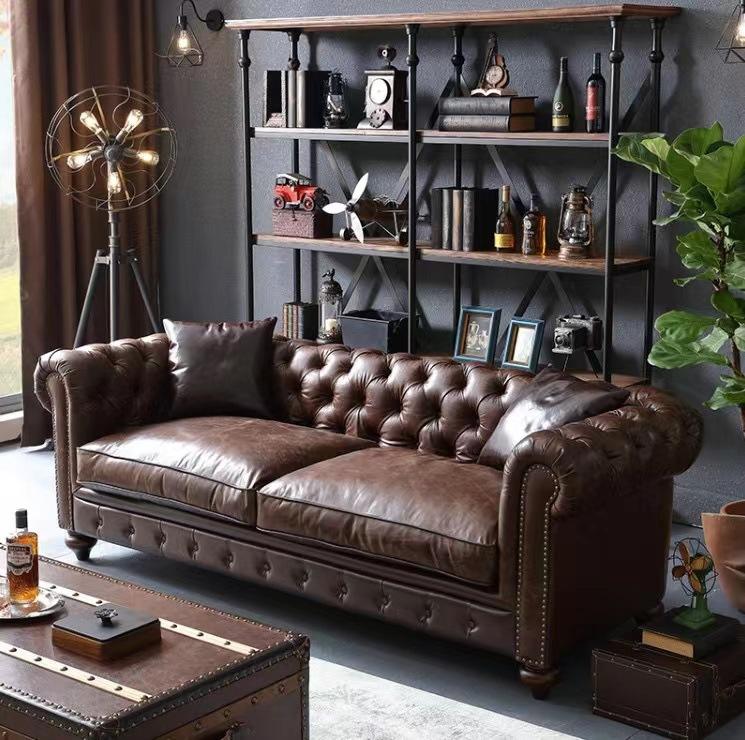 Set di divani americani di lusso Mobili per soggiorno Divani con bottoni Divano marrone Classico Vintage Top in PU Vera pelle Divano Chesterfield