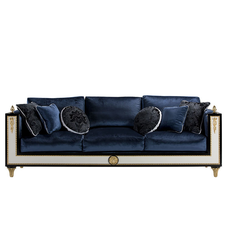 Lusso barocco 2 posti divano blu reale velluto oro leone emblema finiture dorate squisiti mobili Villa per interni palazzo