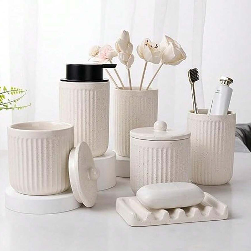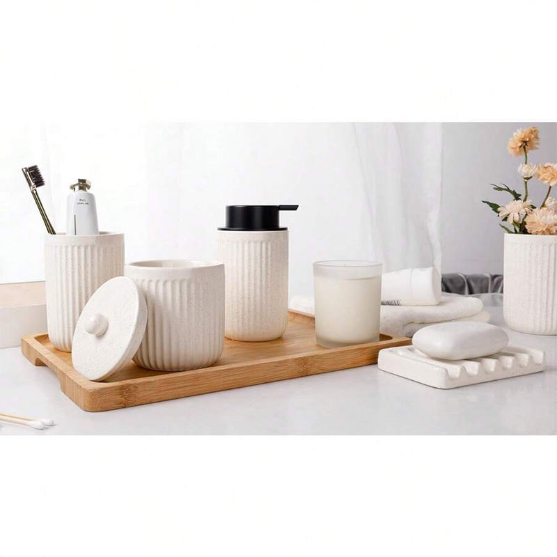 Luxury Beige Ceramic Bathroom Set Counter Soap Set Bathroom Decor and Toothbrush Holder Set