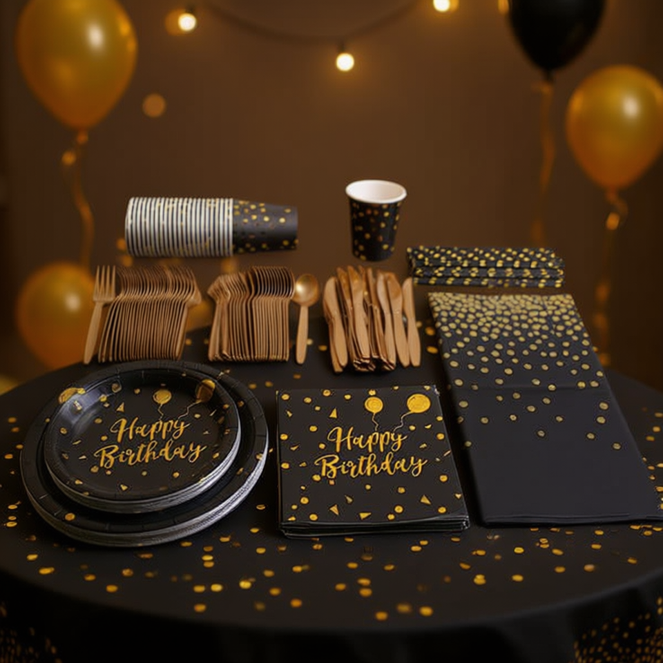 Luxury Black Gold Disposable Dinnerware Set 201Pcs For Birthday Parties Recycled Paper Tablecloth Cups Napkins Forks Knives