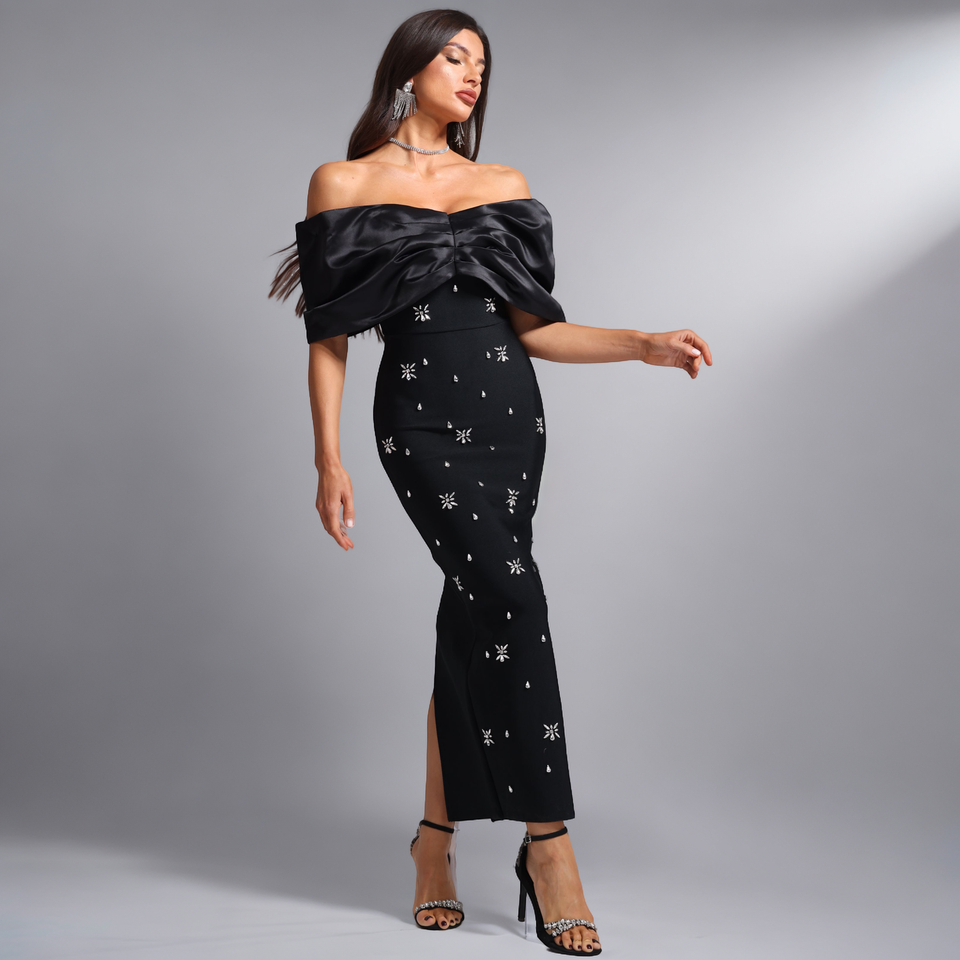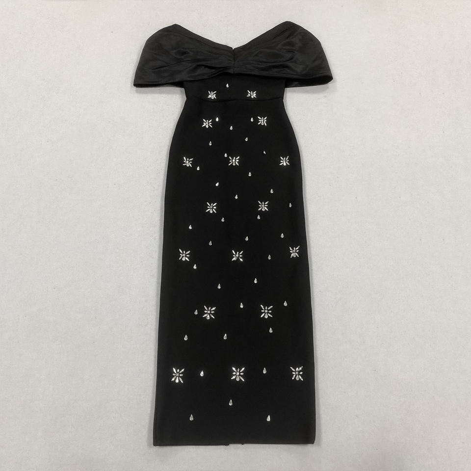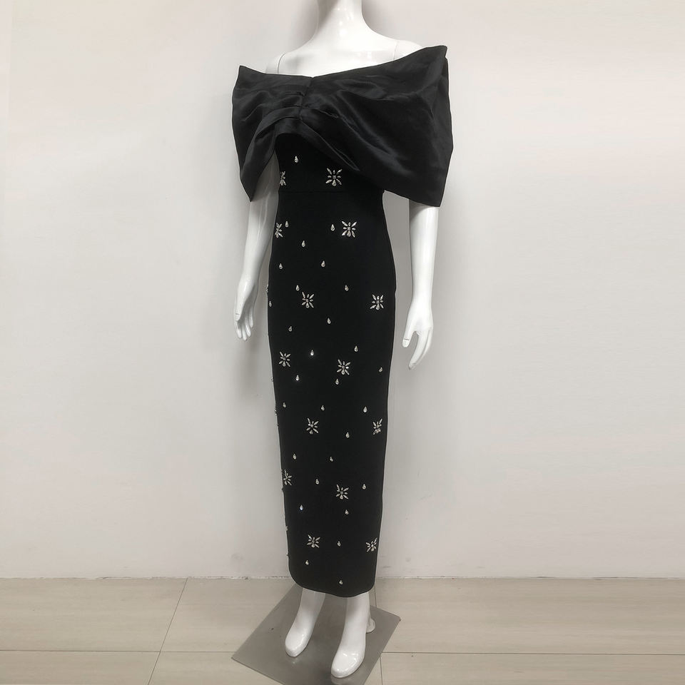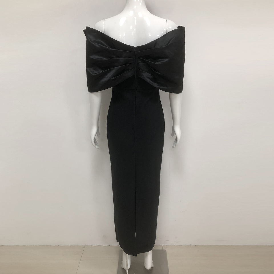 Luxury Black Off Shoulder Bandage Party Club Dress Rhinestones Slit Mermaid Gown Formal Events Evening Dresses With Satin Bow