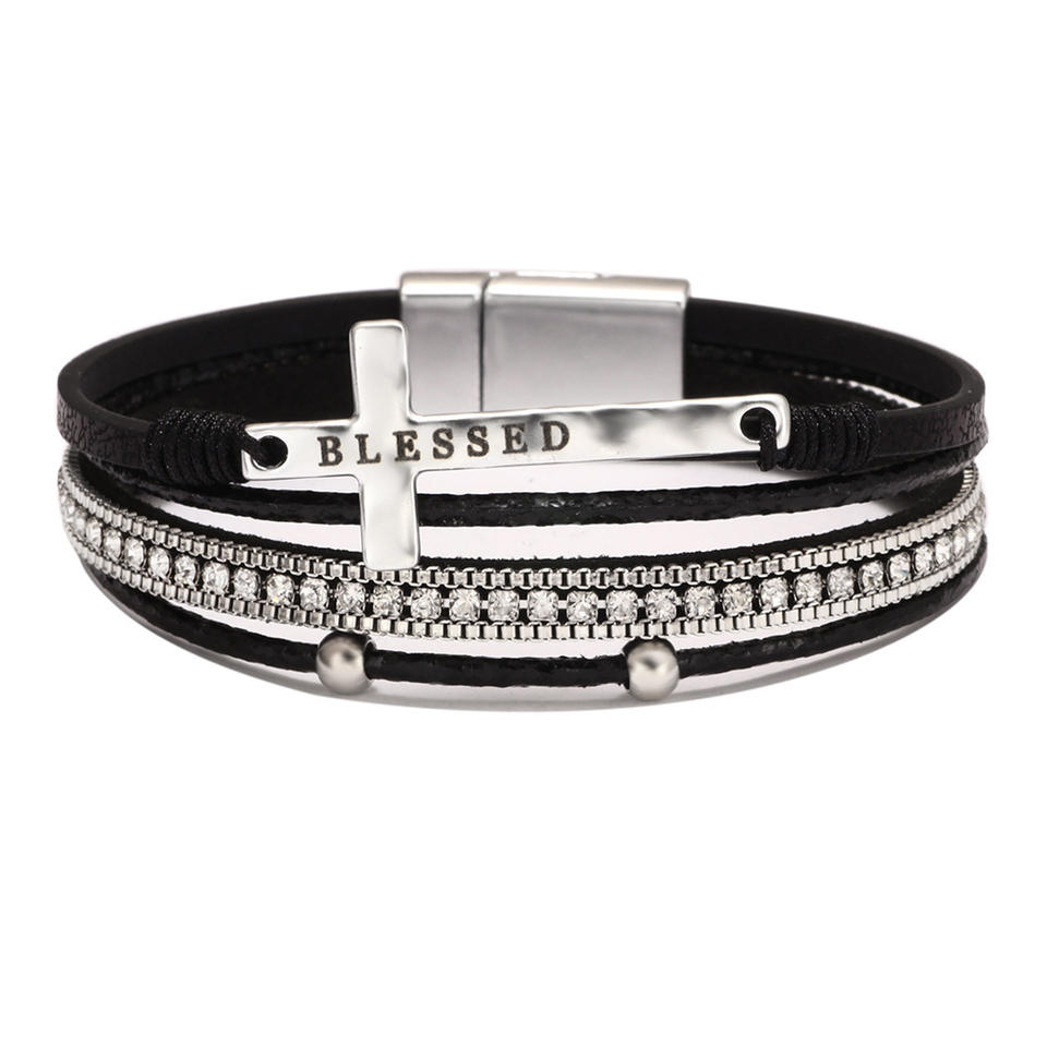 Luxury Bohemian Magnetic Clasp PU Leather Christian Cross Bracelets Multi Layer Leather Crystal Rhinestone Bracelet