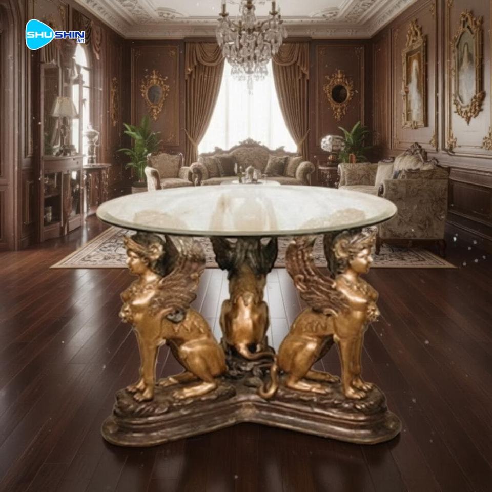 Luxury Bronze Figure Coffee Table Classical Female Sculpture & Cherub Table Base for Upscale Indoor Living Decor