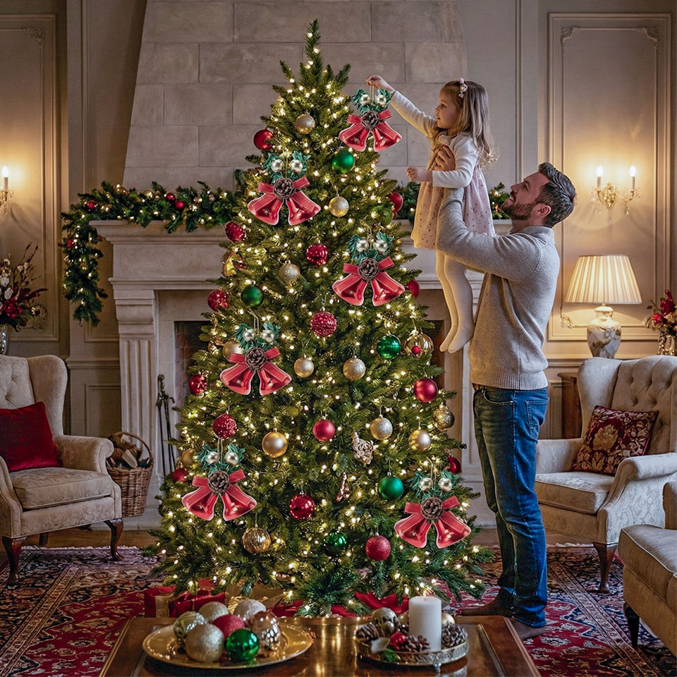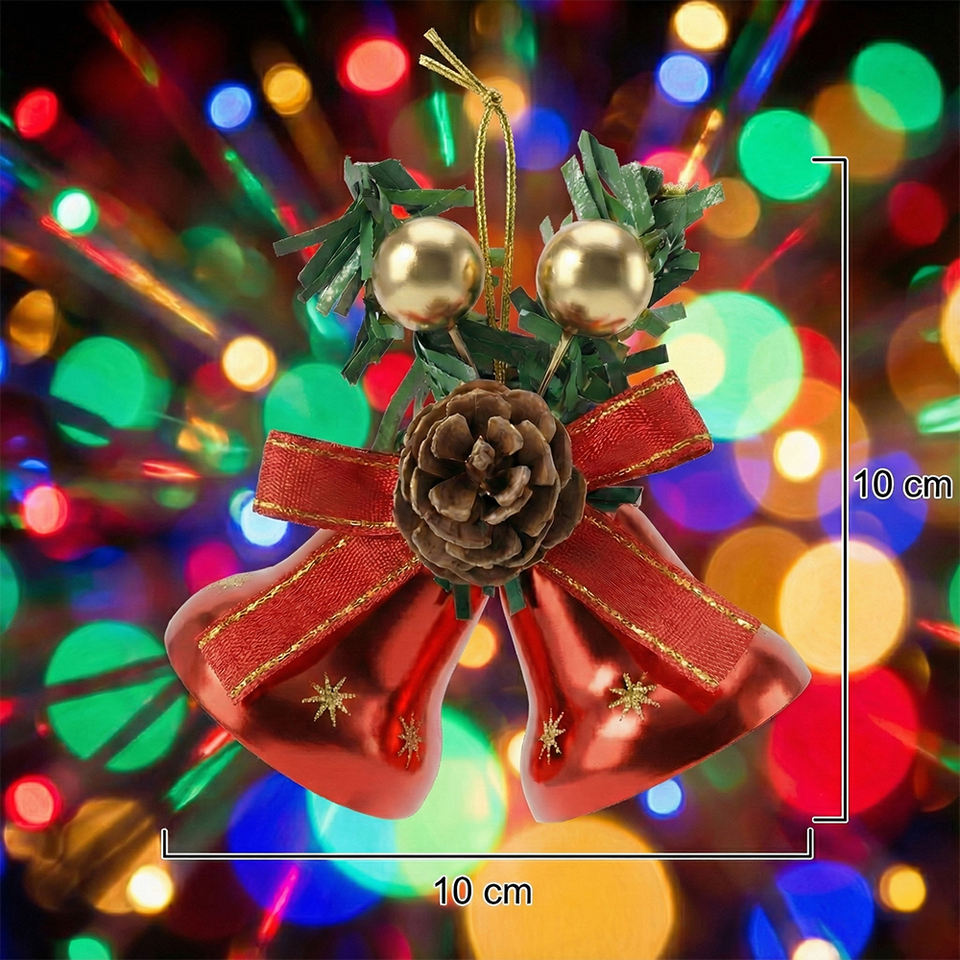 Lussuosa Decorazione Natalizia a Forma di Albero con Due Campanelle Rosse, Fogliame d'Aglio e Nastro Dorato, Eco-Friendly per Esterni