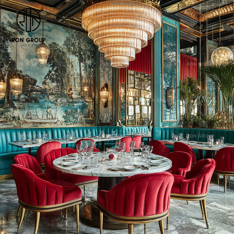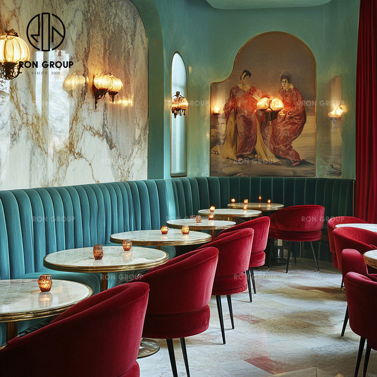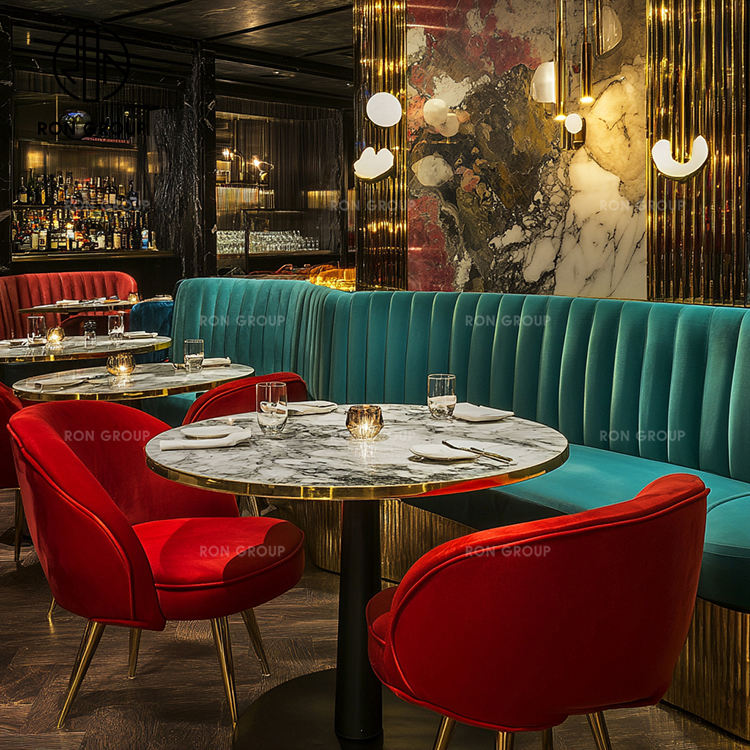 Tavolo Rotondo di Lusso con Piano in Marmo per Hotel Commerciali, Arredamento per Caffè e Ristoranti in Velluto Rosso e Verde, Tavolo e Sedia, Divano e Posti a Sedere