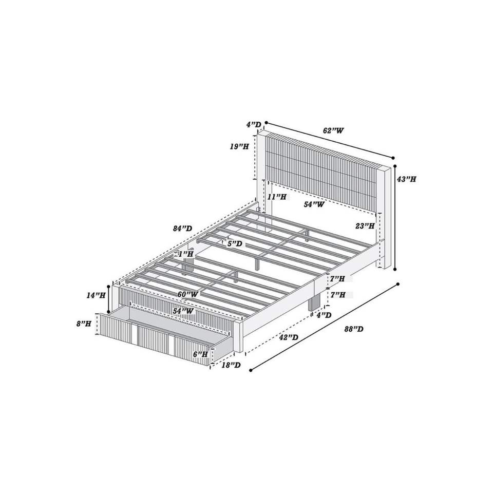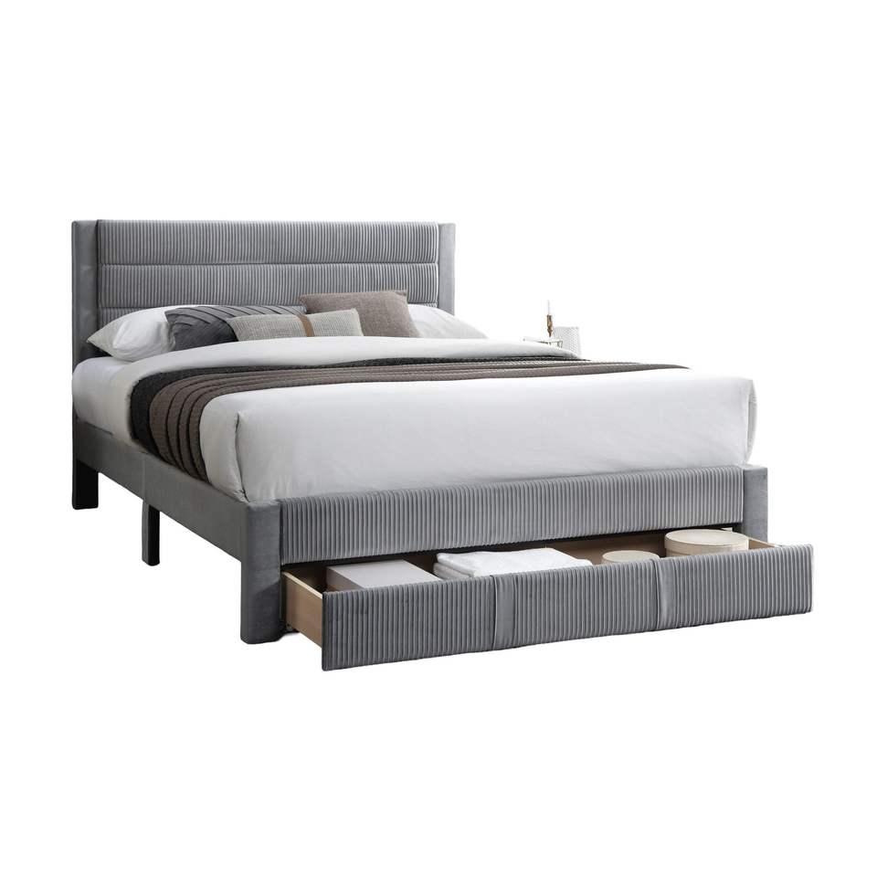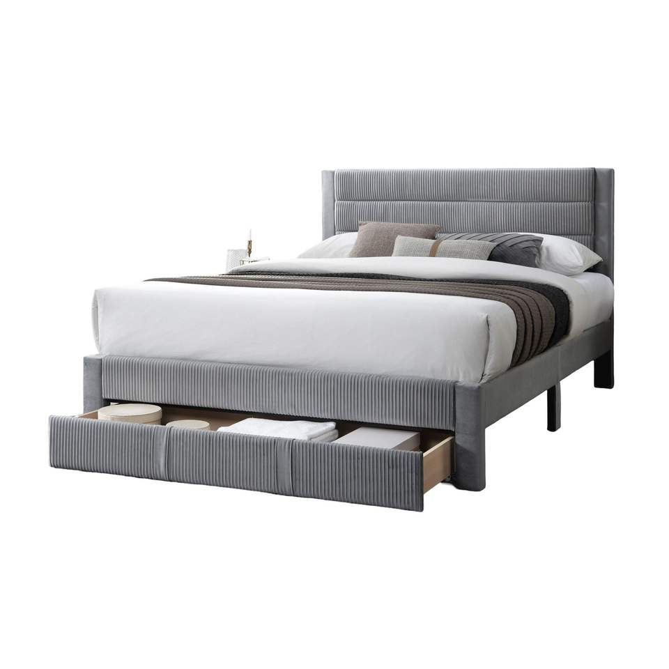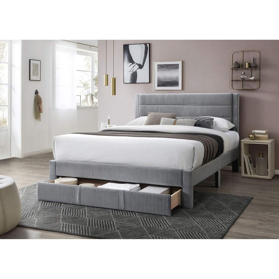 Letto Matrimoniale Contemporaneo di Lusso con Cassetto Contenitore, Testiera in Velluto a Coste Grigio, Struttura Imbottita di Lusso