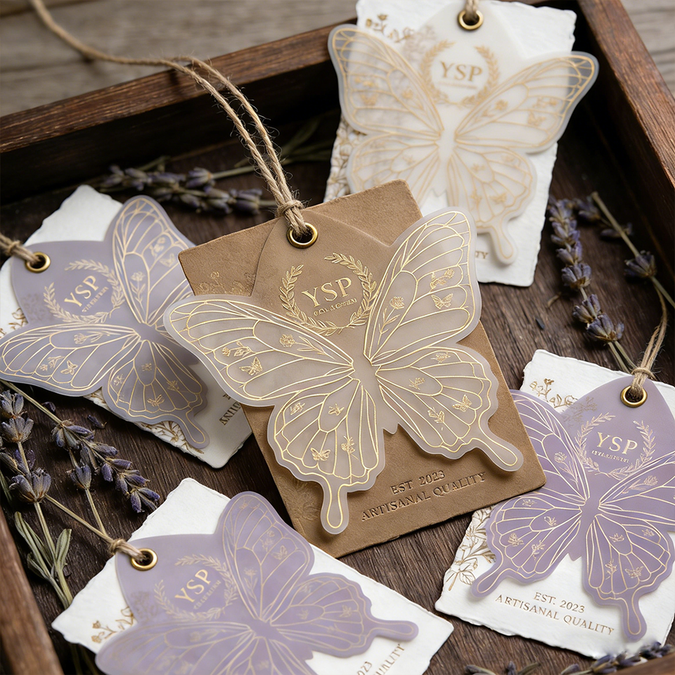 Etichetta di Lusso Personalizzata a Forma di Farfalla in Carta Velina con Stampa in Lamina d'Oro per Boutique, Abbigliamento, Matrimoni, Regali e Branding