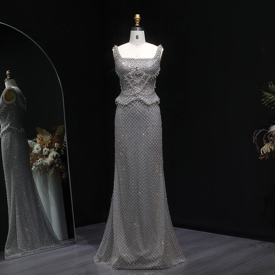 Luxury Dubai Gray Staight Evening Dress With Straps Arabic Women Wedding Formal Party Gowns Lsz631