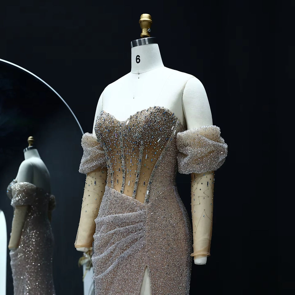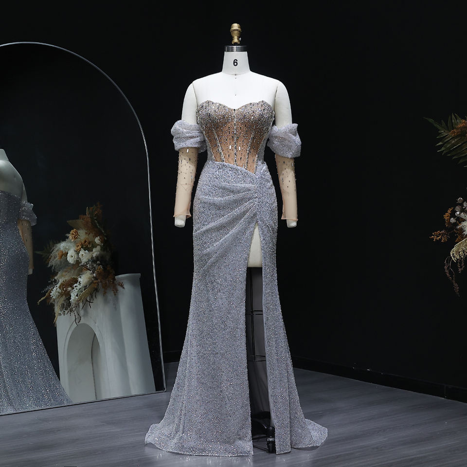 Luxury Dubai Mermaid Crystal Silver Evening Dress With Sleeves Slit Arabic Women Wedding Party Gown LSZ426