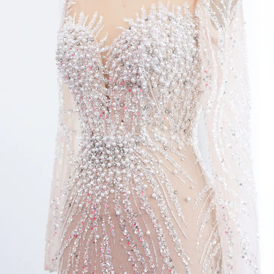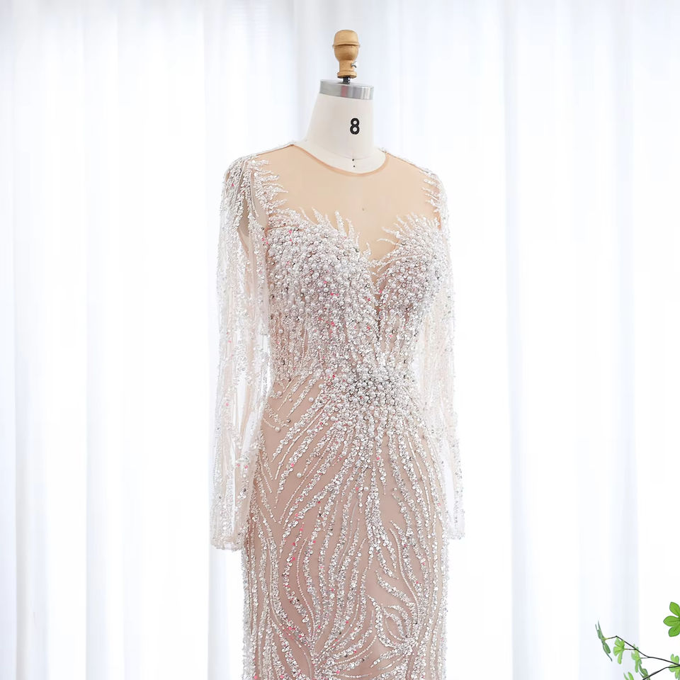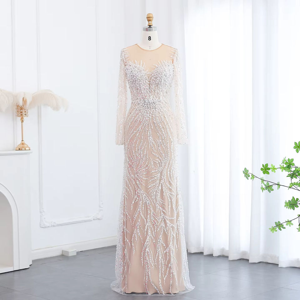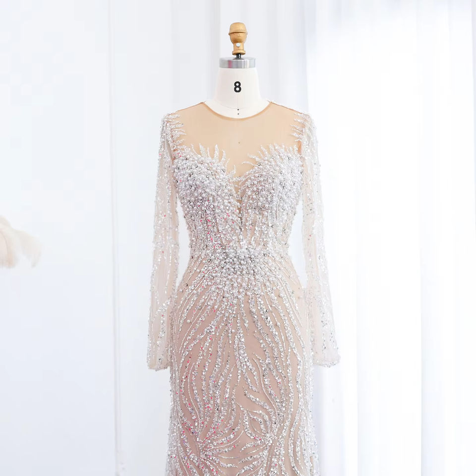 Luxury Dubai White Nude Mermaid Evening Dresses for Women Elegant Long Sleeves Women Wedding Party Gowns LSZ111