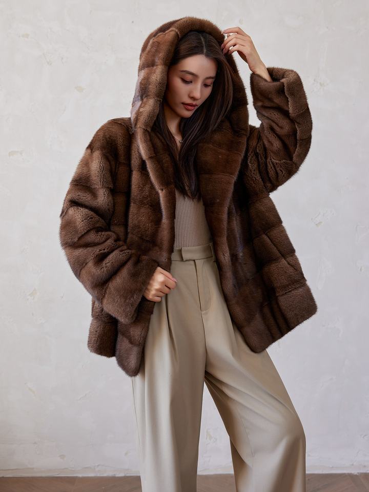 Luxury Elegant Imported High-End Hooded Mink Coat Price Long with Whole Brown Mink Skin Fur Mink Coat with Belt Hood Womens