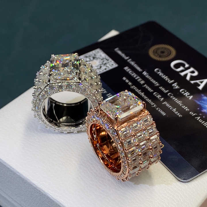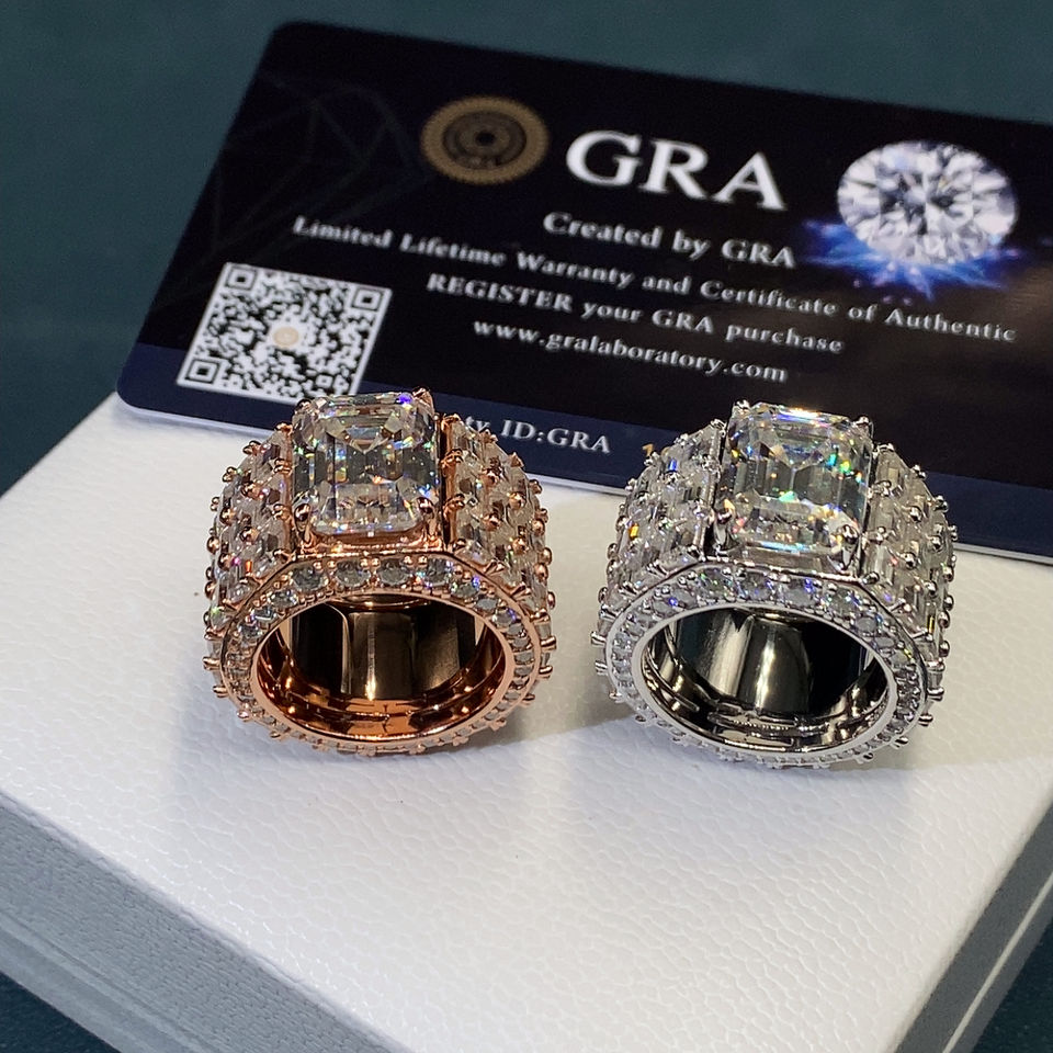 Moissanite taglio smeraldo: La moissanite a taglio smeraldo offre un aspetto unico ed elegante, con eccellente chiarezza e brillantezza, migliorando l'estetica complessiva dell'anello.