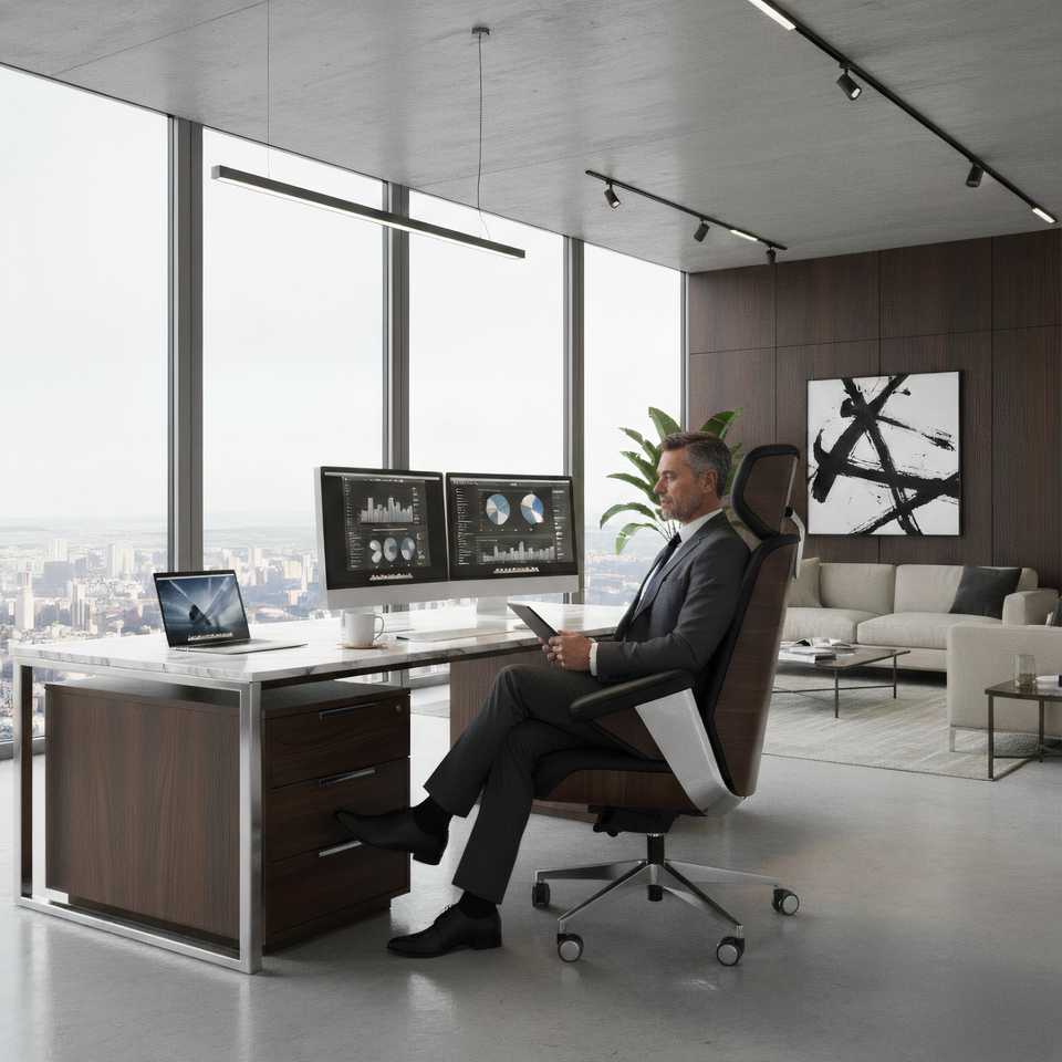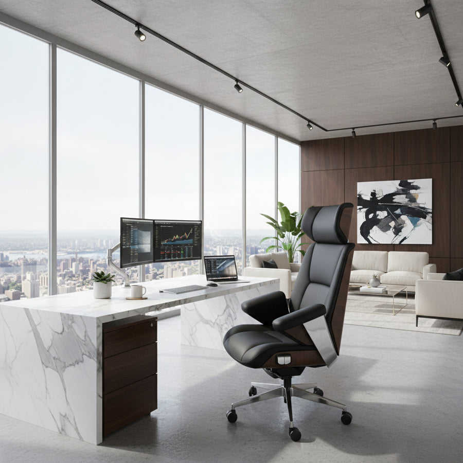 Luxury Executive Office Chair Contemporary Ergonomic High-Back Design Wood Accent Back Chrome Leather PU Foam Lift Chair