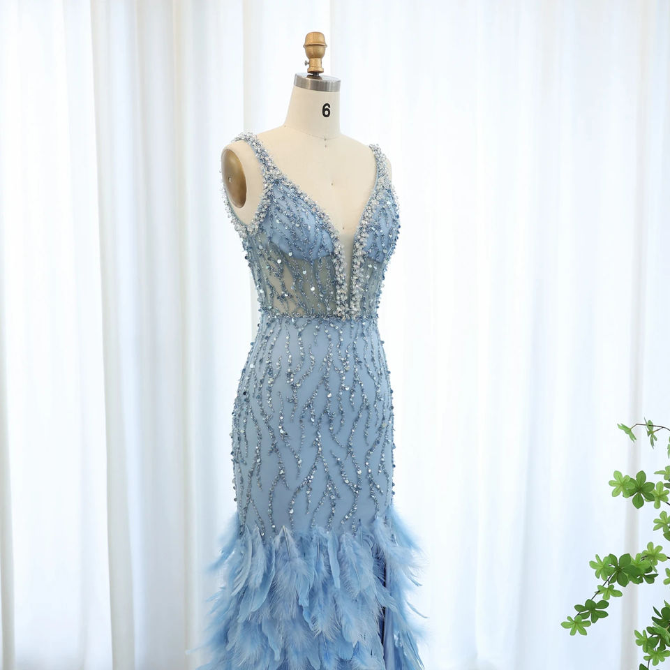 Luxury Feathers Pink Mermaid Evening Dresses for Women Wedding V-Neck Blue Side Slit Long Prom Party Dress SZ184