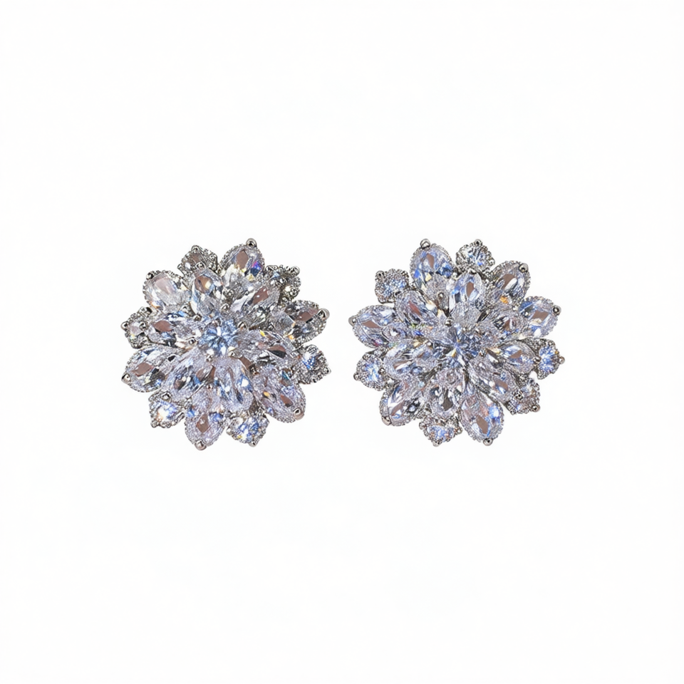 Luxury Flower Stud Earrings 925 Silver Crystal Rhinestone Wedding Jewelry Women's Claw Setting