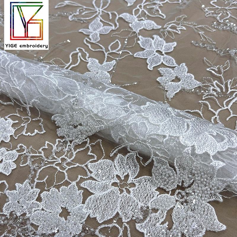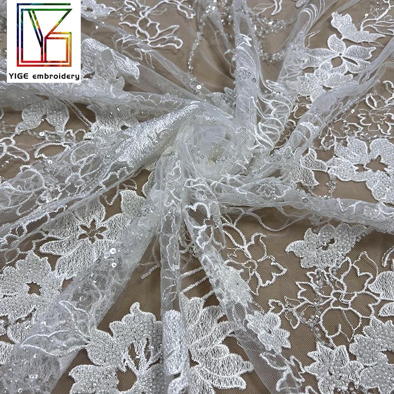 Tessuto in Pizzo Francese di Lusso con Ricamo 3D di Fiori e Paillettes, Abito da Sposa Bianco con Cristalli e Perline, Tulle con Paillettes, Tessuto in Pizzo con Perline per Sposa