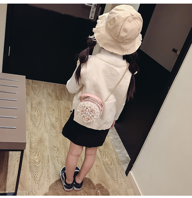 Luxury Girl Flower Pearl Decoration Chain Round Crossbody Shoulder Bag Pu Leather Mini Purse Handbag for Kids
