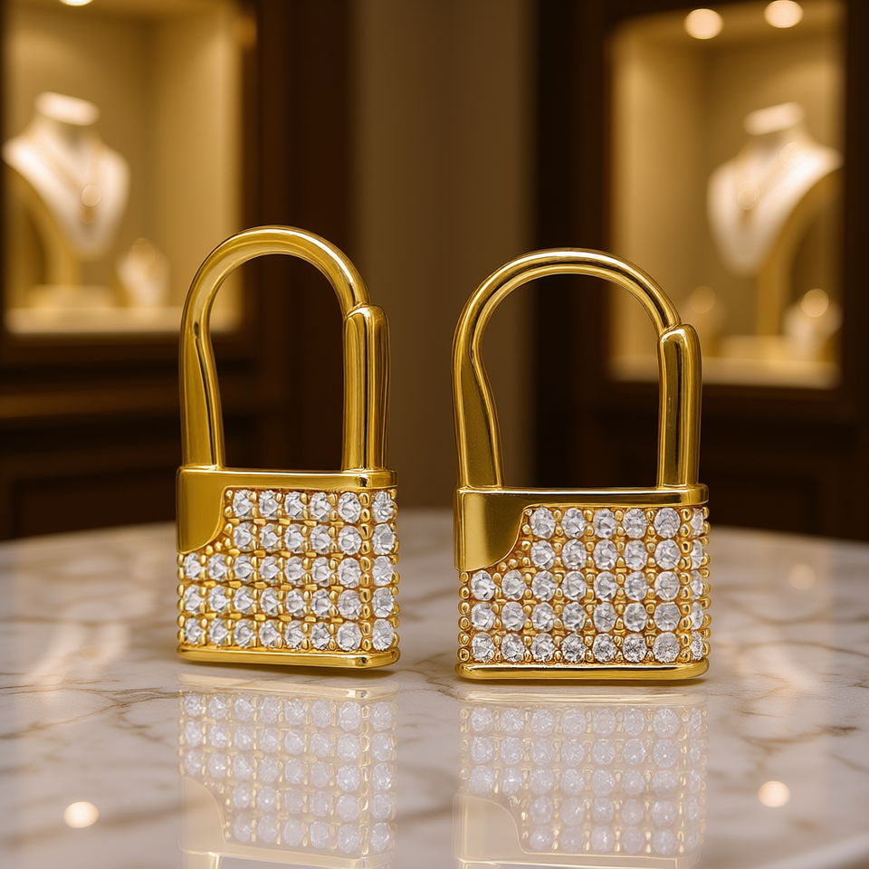 Orecchini a perno di lusso placcati oro con cristalli e chiusura a lucchetto per donna, gioielli alla moda con micro inserti per l'uso quotidiano