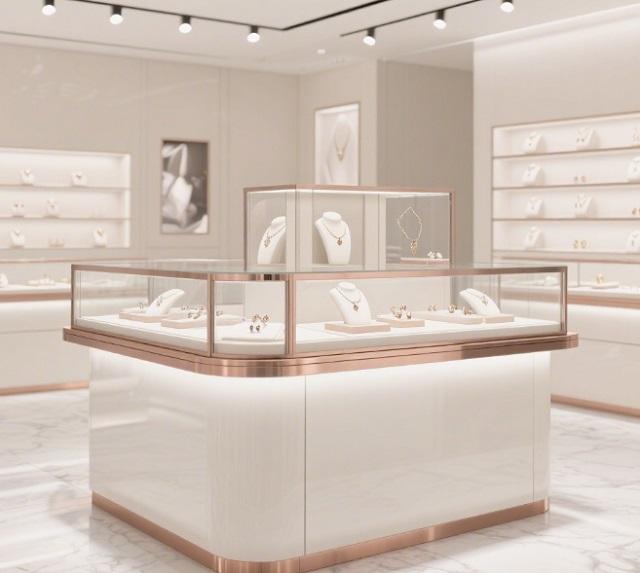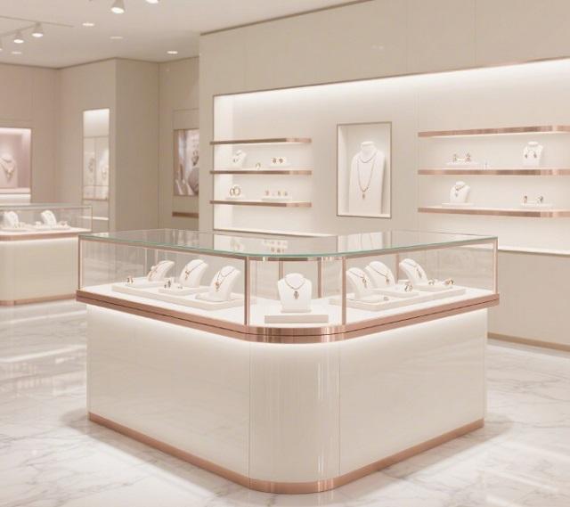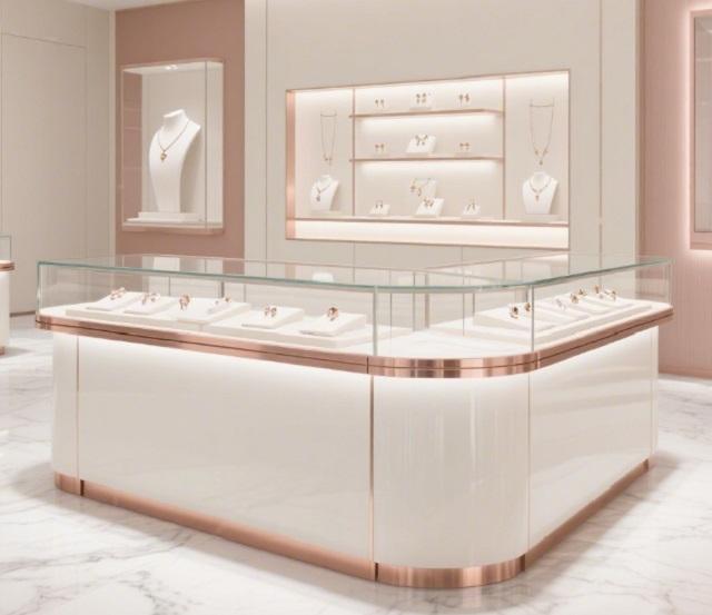Espositore per Gioielli di Lusso con Angoli Arrotondati, Vetrina in Vetro Crema e Oro Rosa con LED per Negozi al Dettaglio