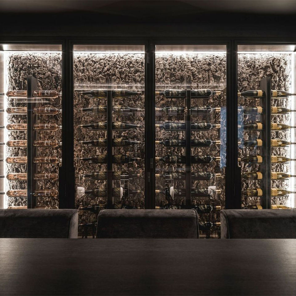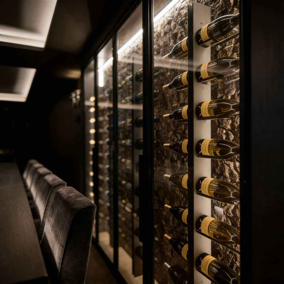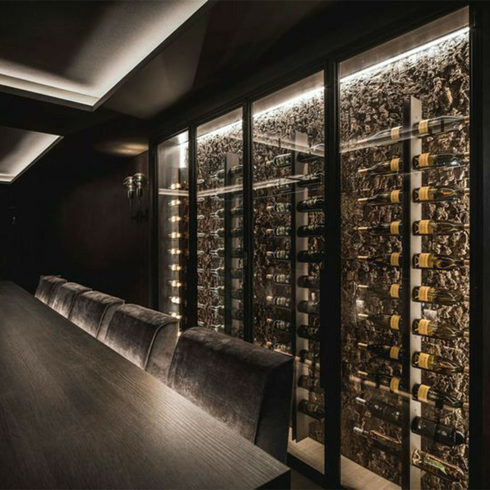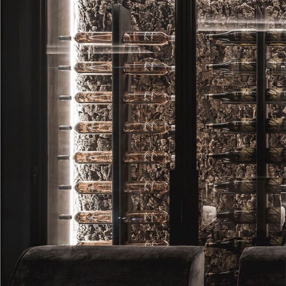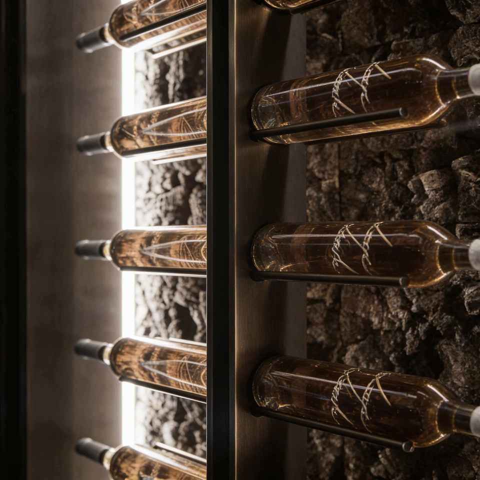 Mobile Portabottiglie di Lusso con Illuminazione LED, Ecologico e Moderno, con Sfondo Texturizzato e Telaio in Acciaio Inox per Bar/Cantina