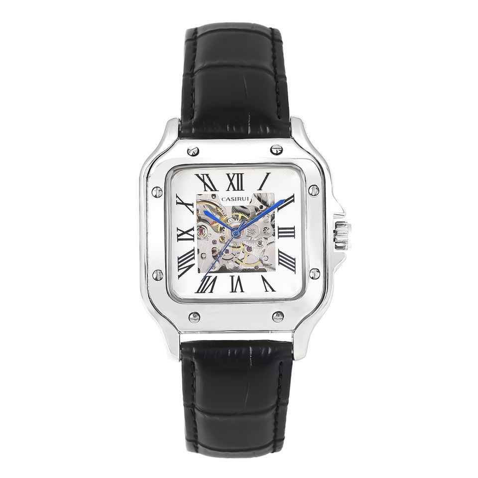 Luxury Men's Retro Business Watch Square Chronograph Automatic Mechanical Pointer Genuine Leather Band Stainless Steel Case