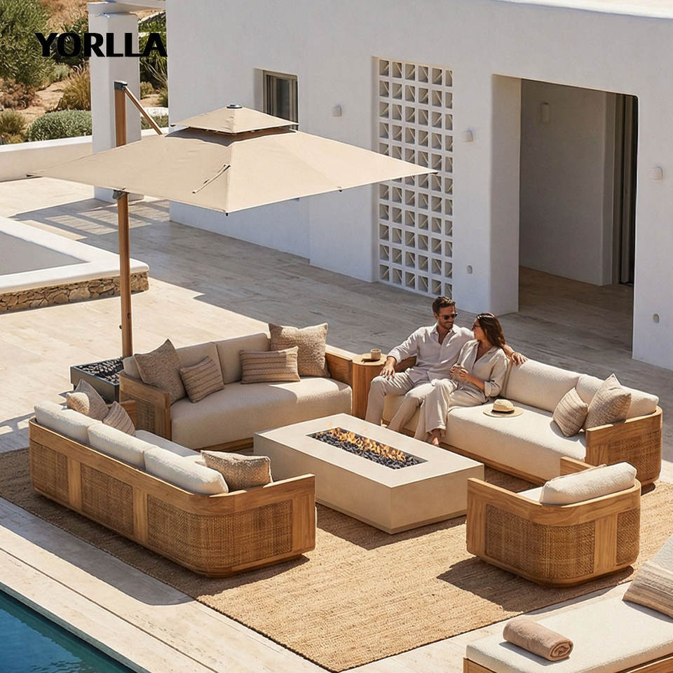 Set di Divani da Giardino di Lusso Moderni in Legno di Teak e Rattan Resistente alle Intemperie, Mobili da Esterno Componibili per Villa, Hotel e Patio
