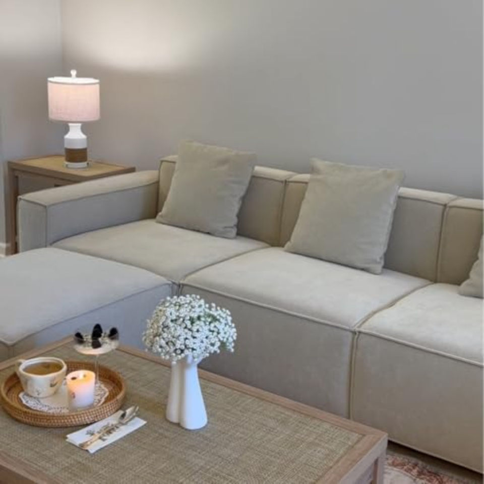 Divano componibile di lusso per soggiorno, set moderno minimalista con ottomana e chaise longue a L, effetto lino, per la casa