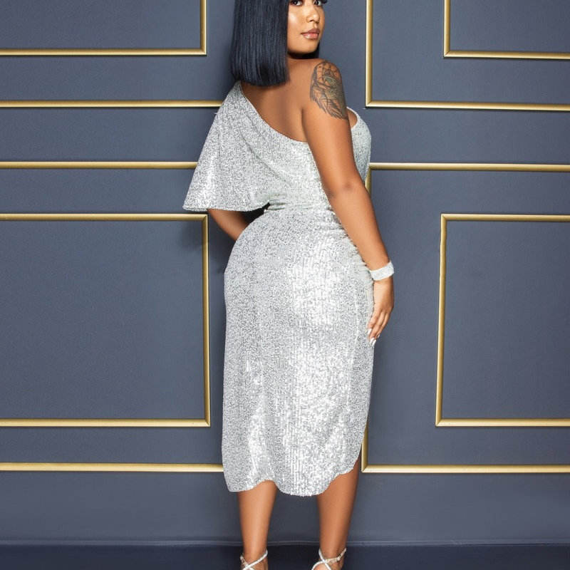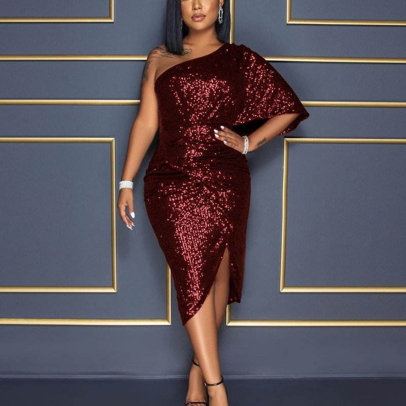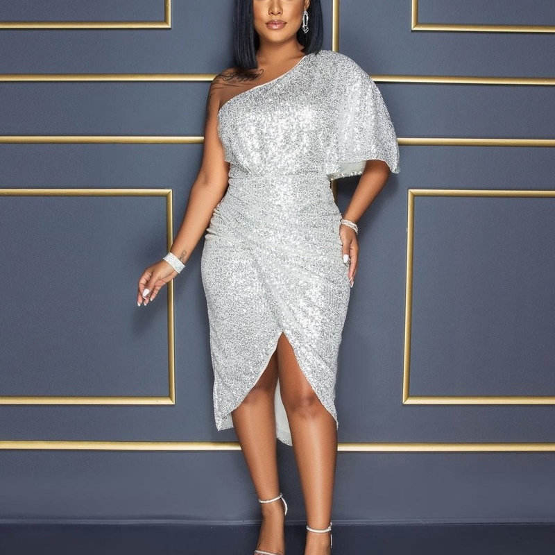 Luxury One-Shoulder Glitter Ball Gown Evening Dress Women XS Size Short Sleeves Pearls 3D Flower Formal Party Floor-Length