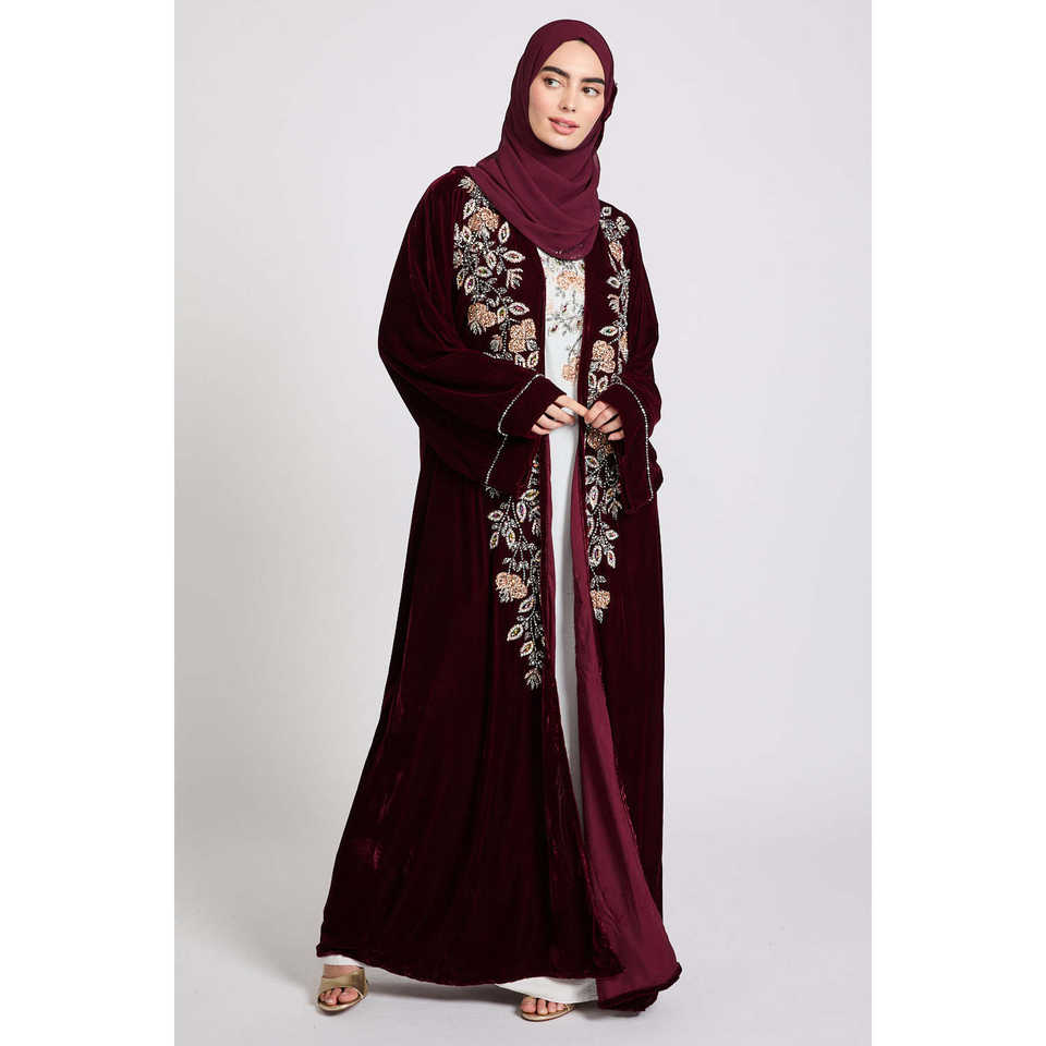 Abito mussulmano di lusso a quattro pezzi in velluto quattro pezzi decorato in raso bordeaux e rosa con volant di Dubai