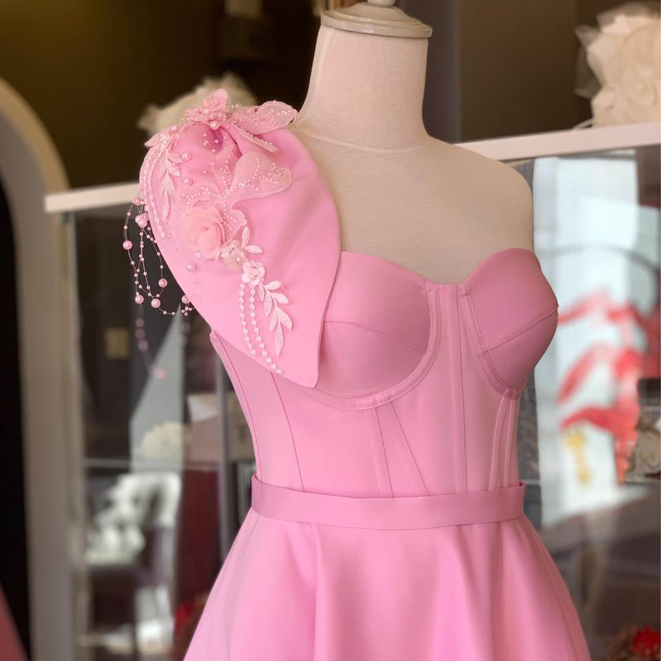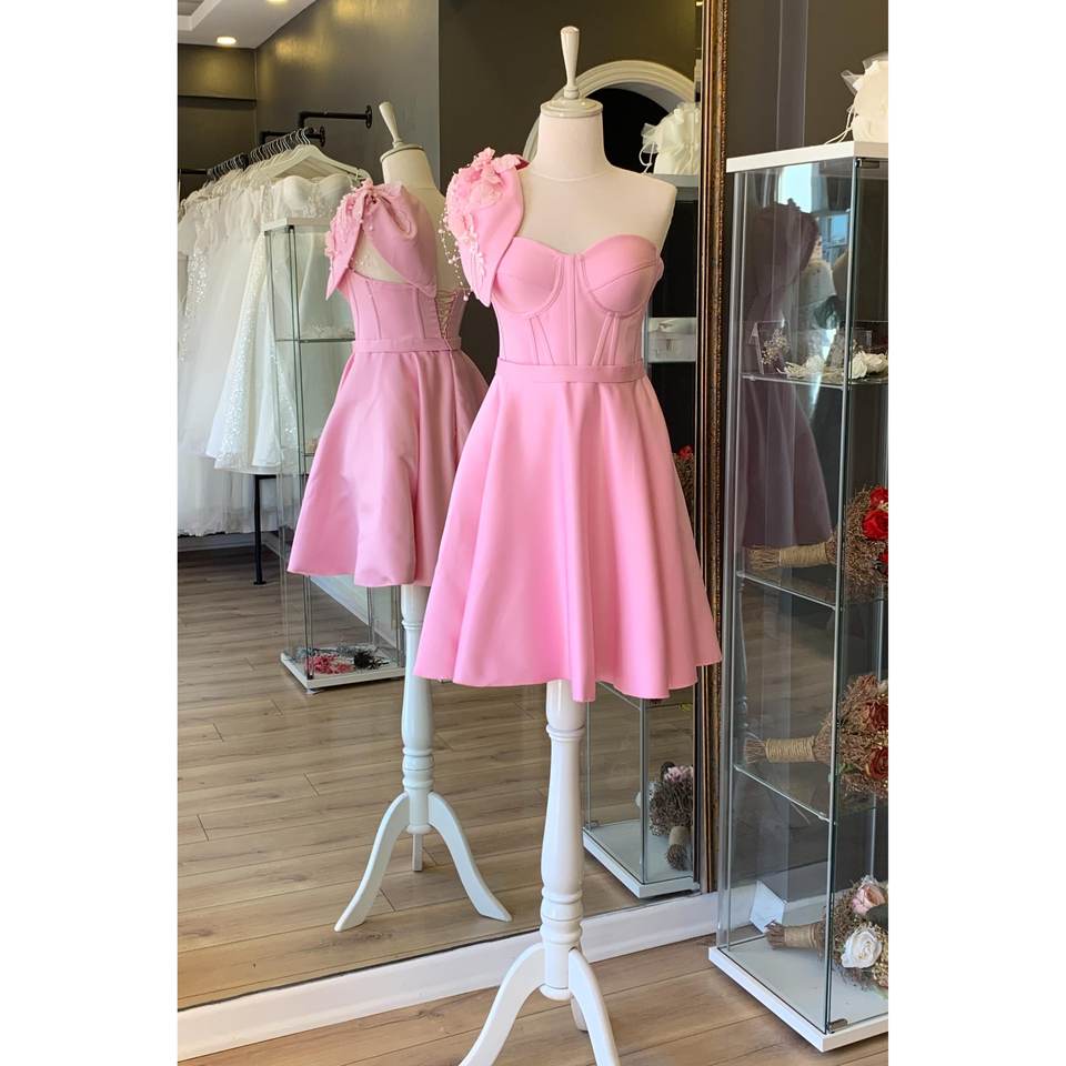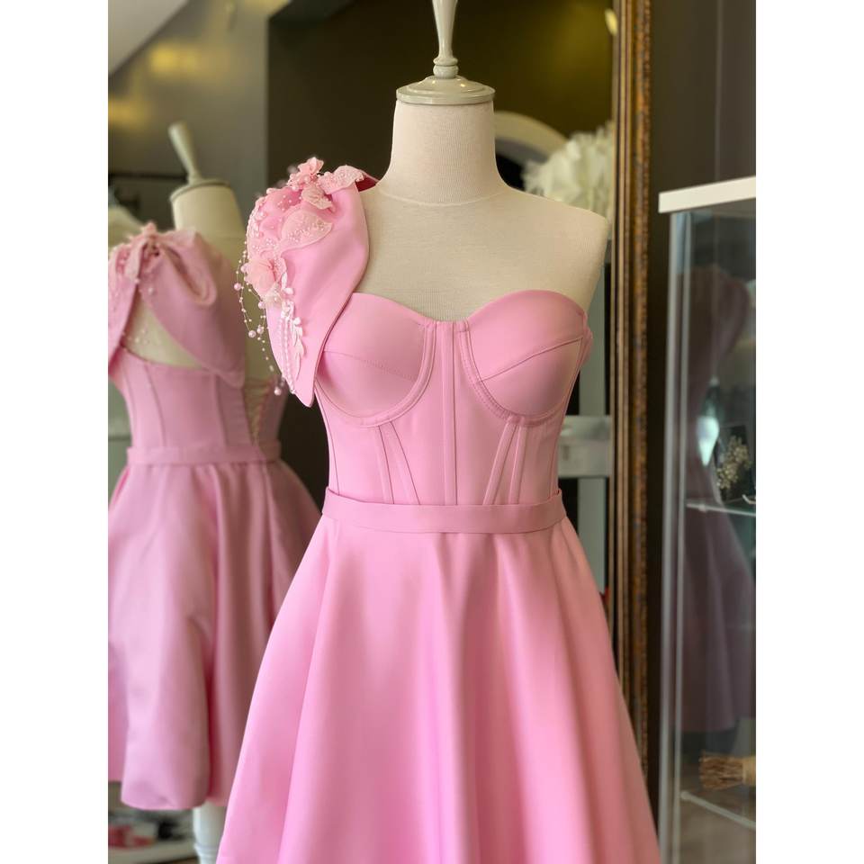 Luxury Pink Satin Ball Gown Mini Dress Spaghetti Strap Short Sleeves Empire Waistline XS to XL Sizes for Evening Parties Nights