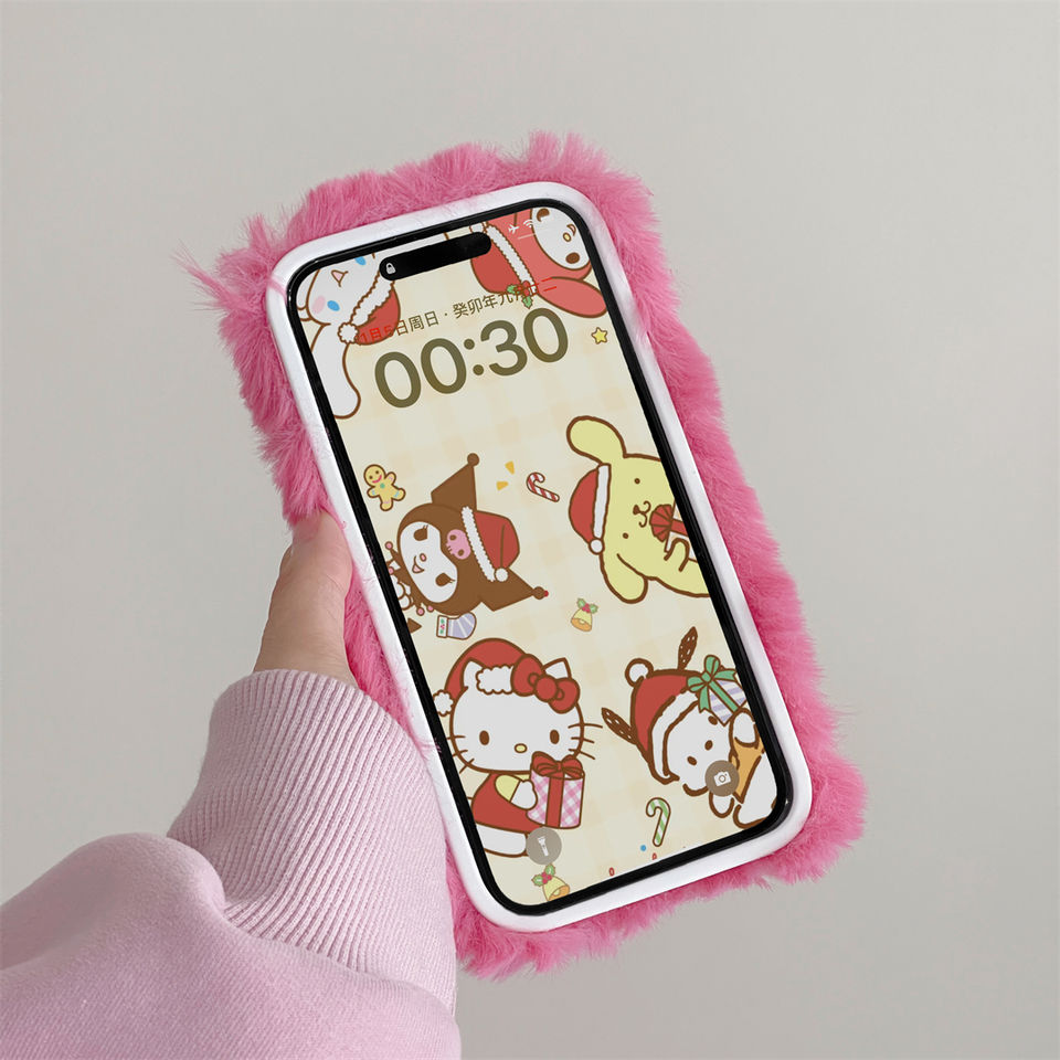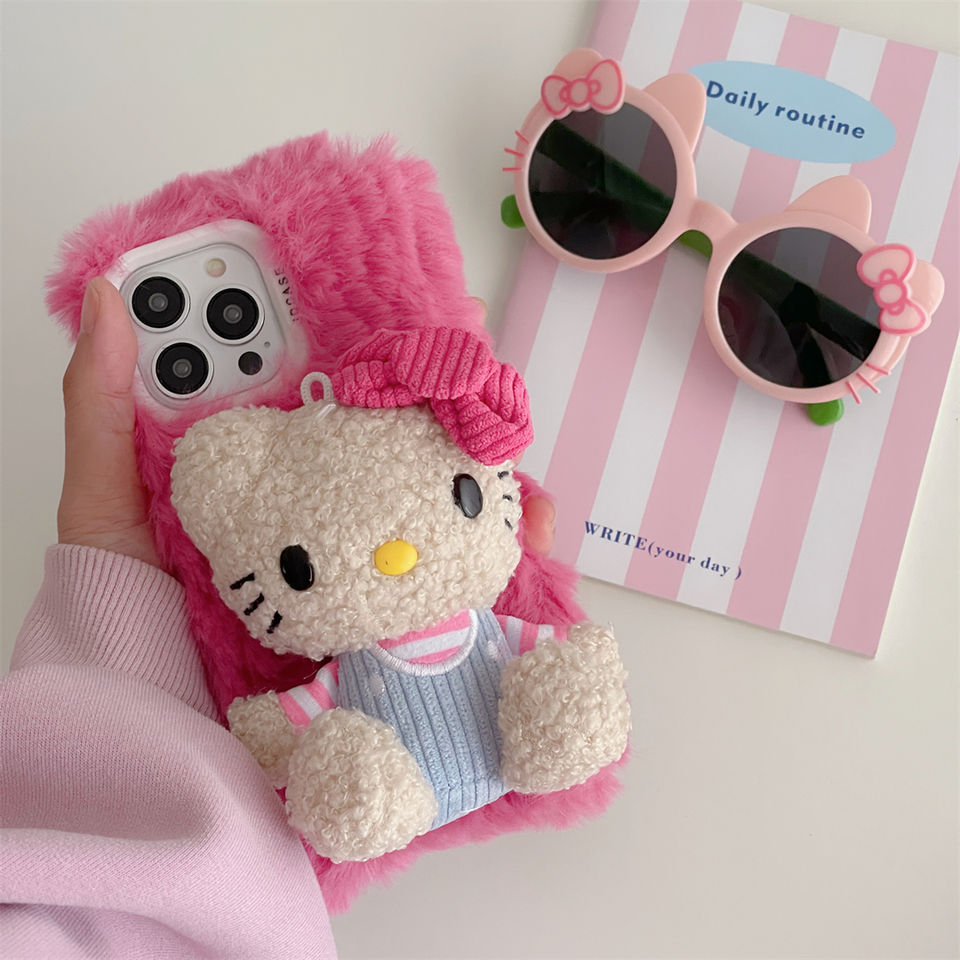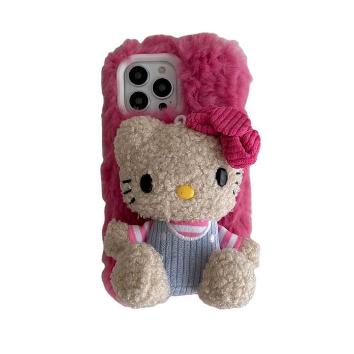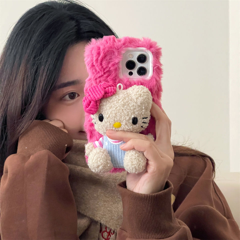 Luxury Plush Texture Anti-Drop Shock-Absorbing Phone Case Instagram Style Pink Kit Cat Compatible for iPhone 12 13 14 15 Pro Max