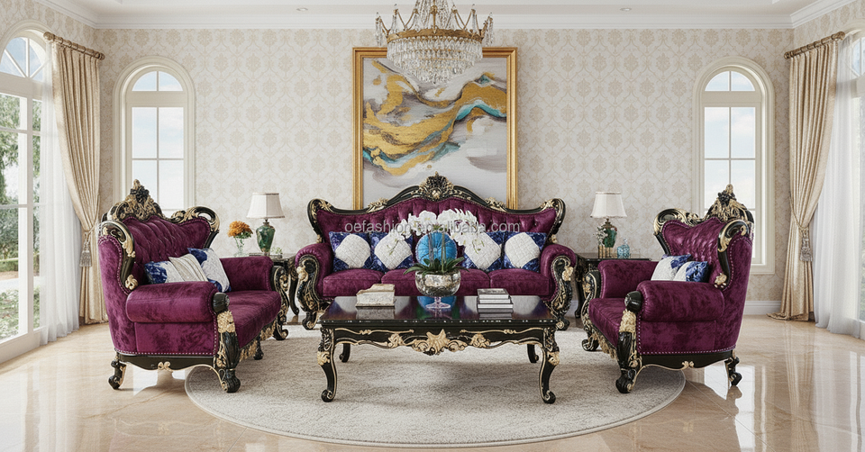 nome:Set di Divani di Lusso in Rosso Damascato con Struttura in Legno Intagliato