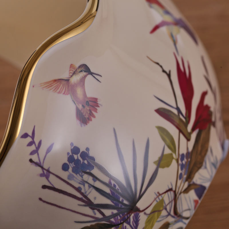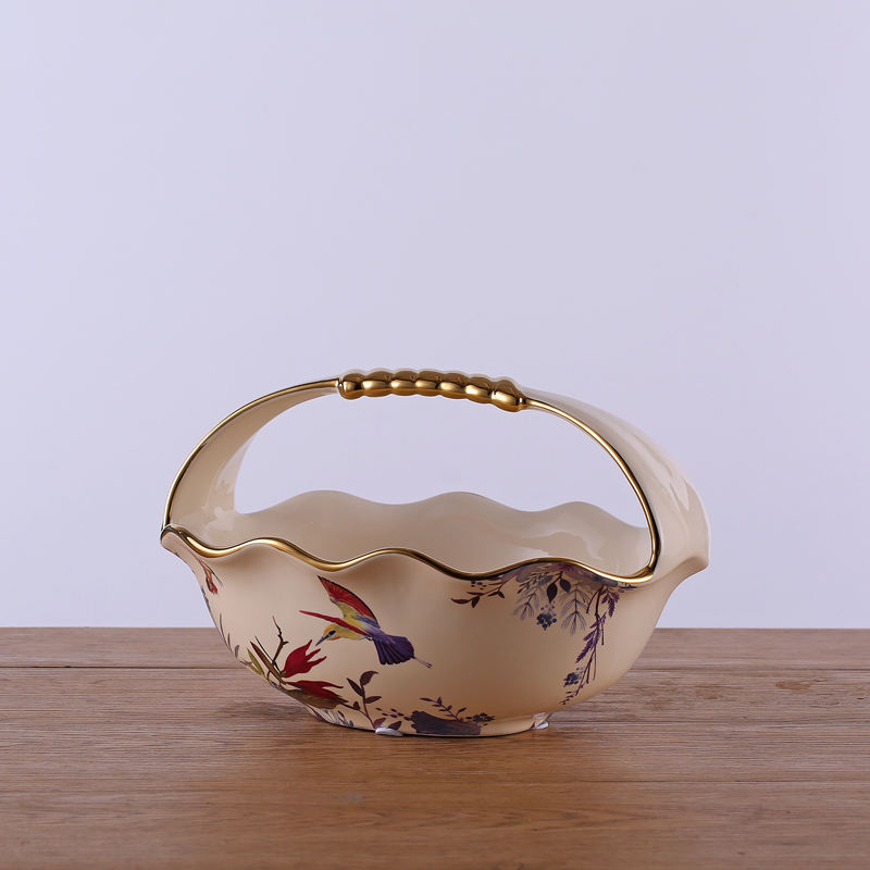 Lussuosa Ciotola Decorativa per Frutta con Manico, Motivo Floreale Crema in Ceramica, Cesto per Fiori in Porcellana