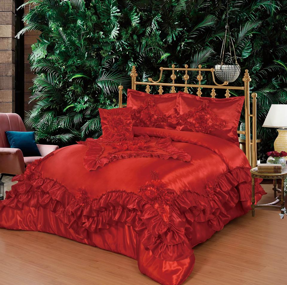 Set di Biancheria da Letto di Lusso in Raso con Ricamo 3D a Rose, Copriletto con Volant Color Crema e Bordeaux, Federe Stile Principessa, Set Completo per Camera da Letto