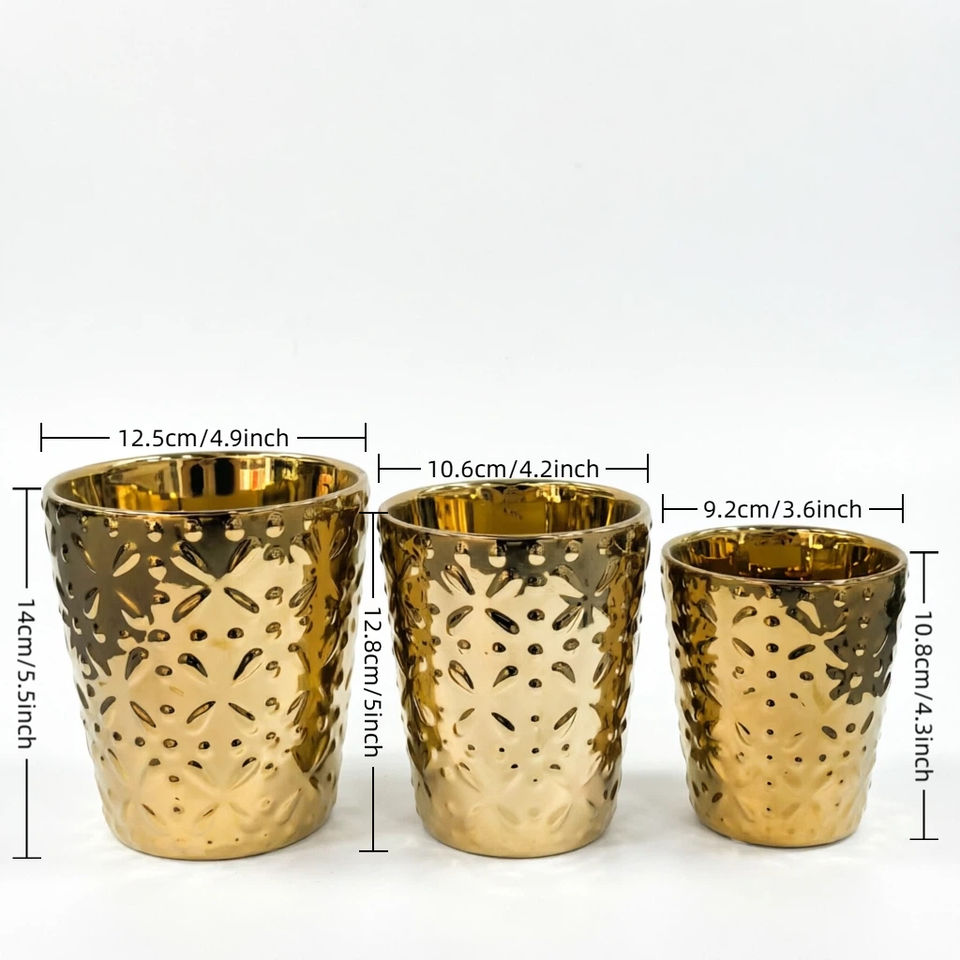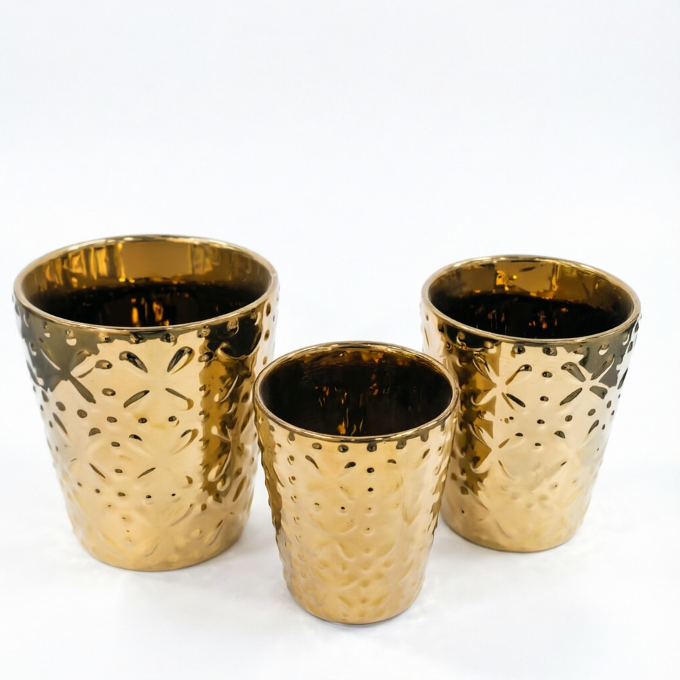 Set di 3 Vasi in Ceramica Dorati Lucidi con Rilievi per Arredamento Moderno da Interni e Soggiorno